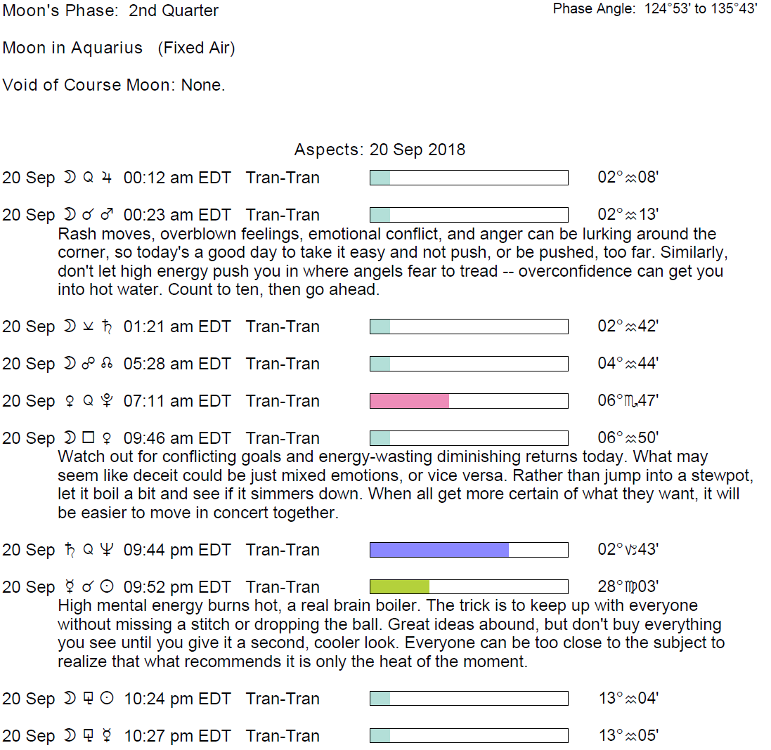 Planet Color Key: The longer the bar, the slower the aspecting planet and the longer the duration of the planet’s transit.