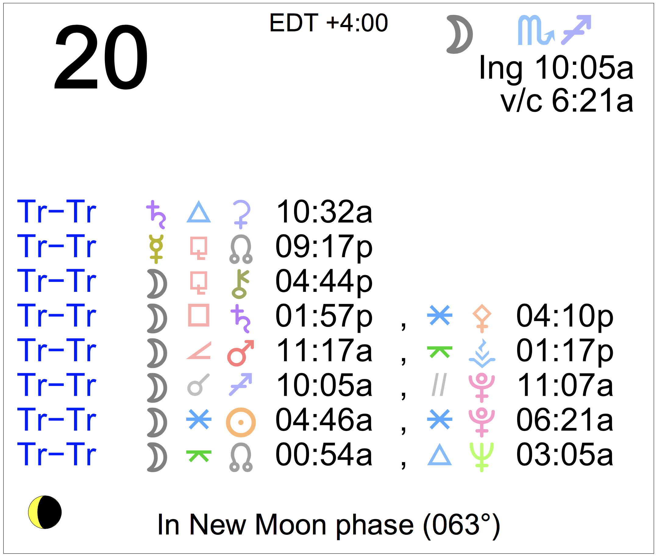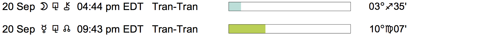 Planet Color Key: The longer the bar, the slower the aspecting planet, and the longer the duration of the planet’s transit.
