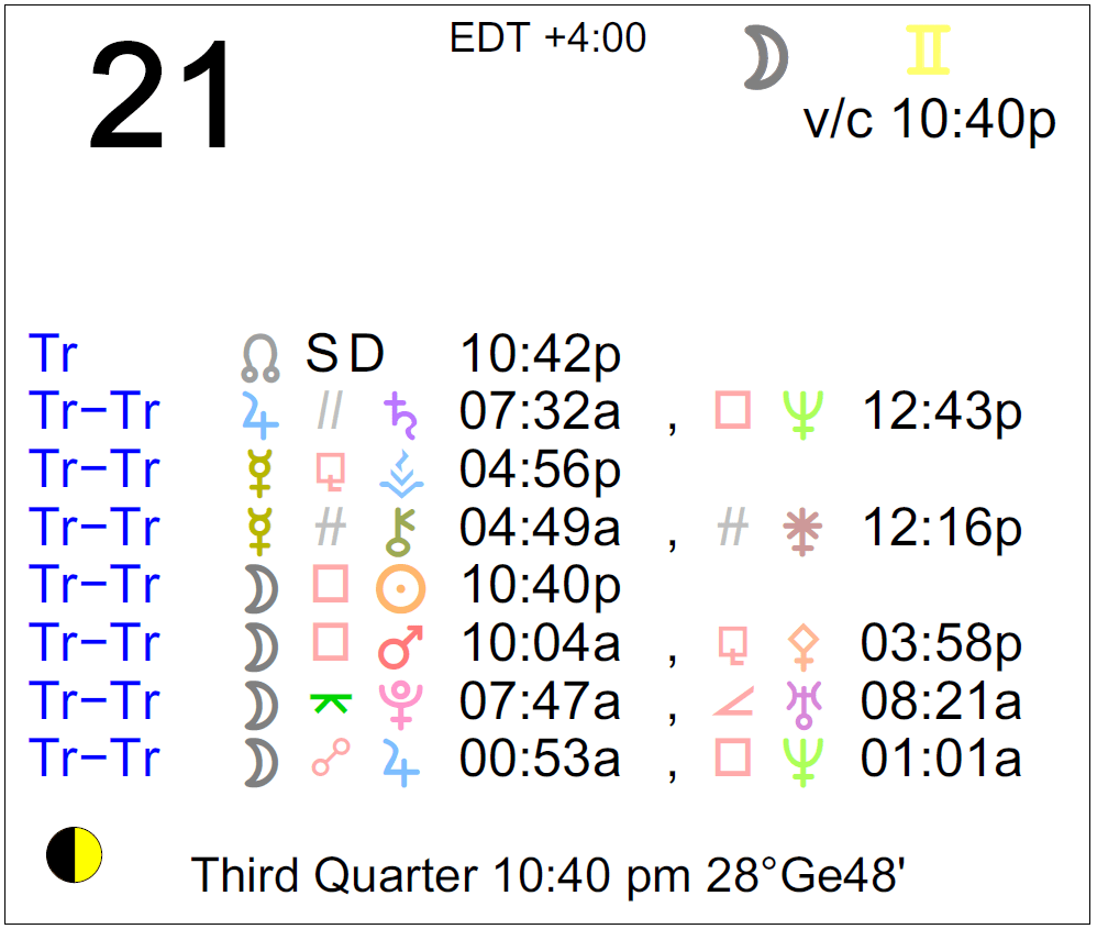 Planet Color Key: The longer the bar, the slower the aspecting planet and the longer the duration of the planet’s transit.