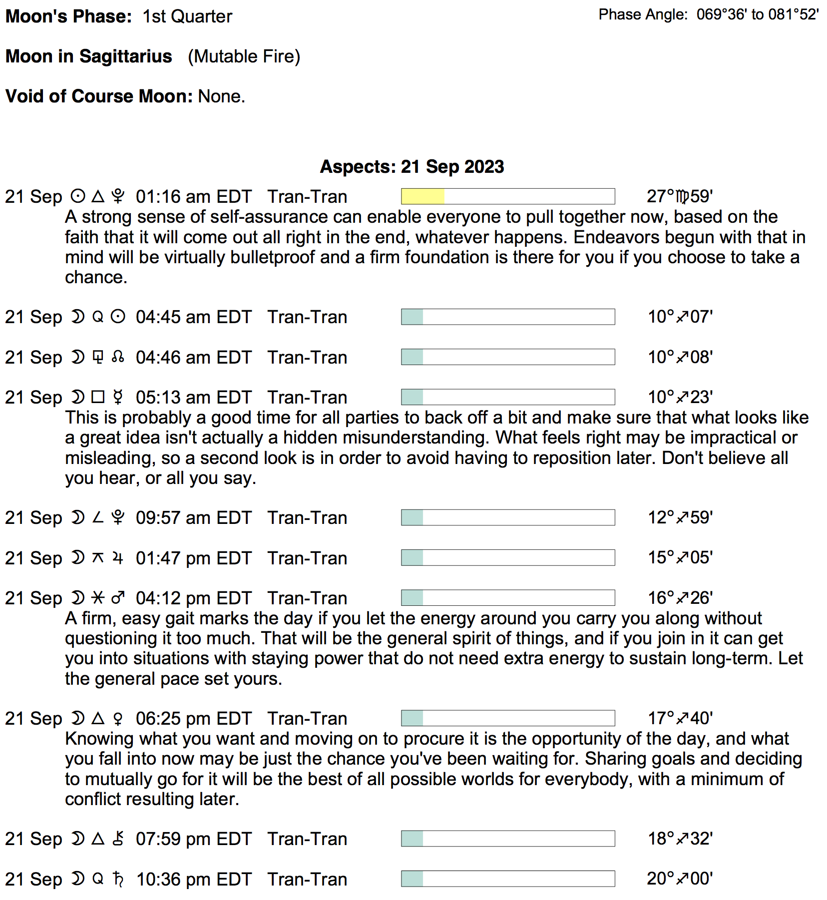 Planet Color Key: The longer the bar, the slower the aspecting planet, and the longer the duration of the planet’s transit.
