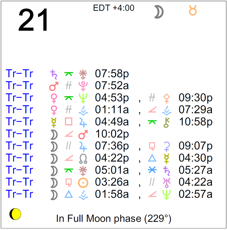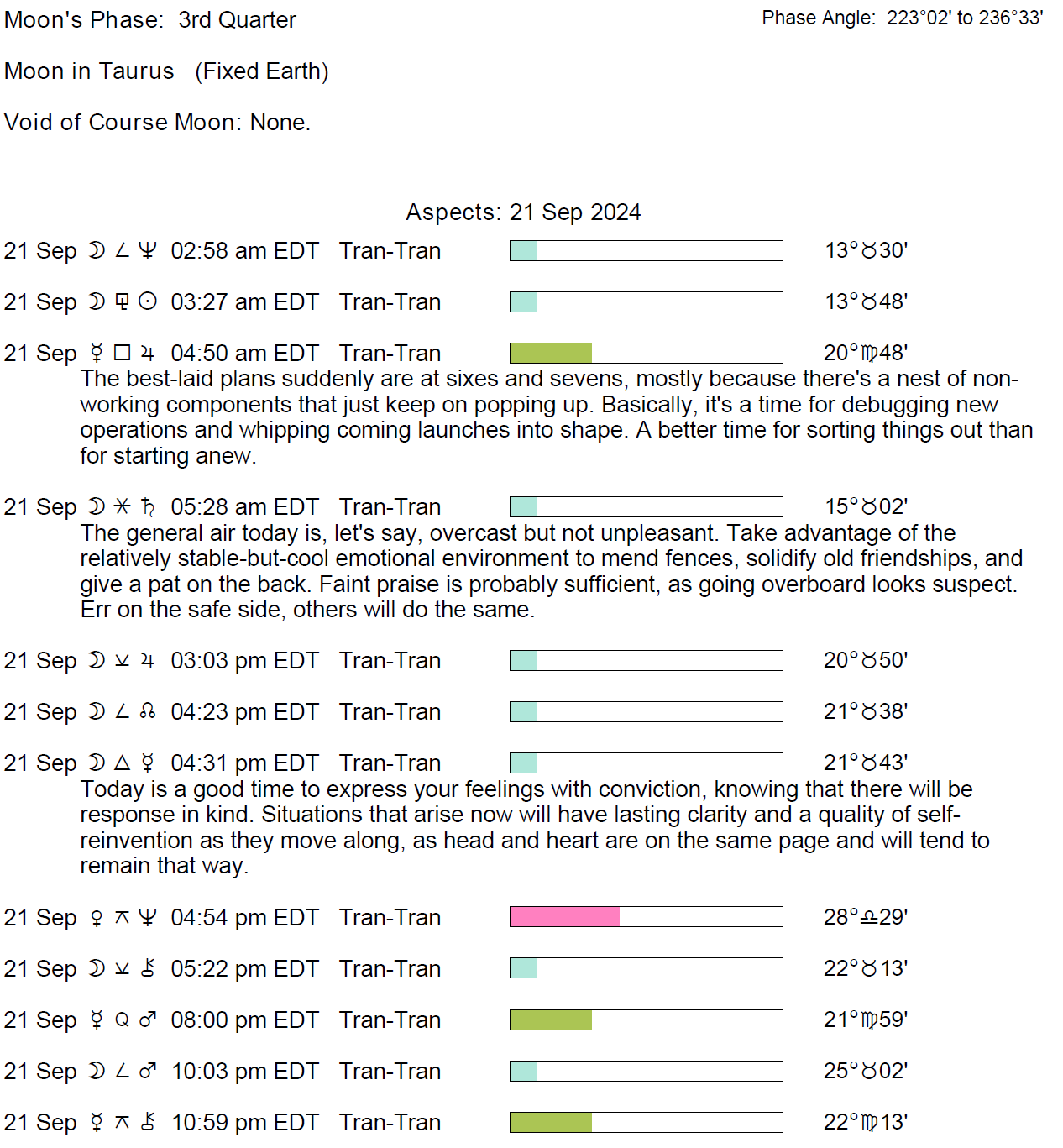 Planet Color Key: The longer the bar, the slower the aspecting planet, and the longer the duration of the planet’s transit.