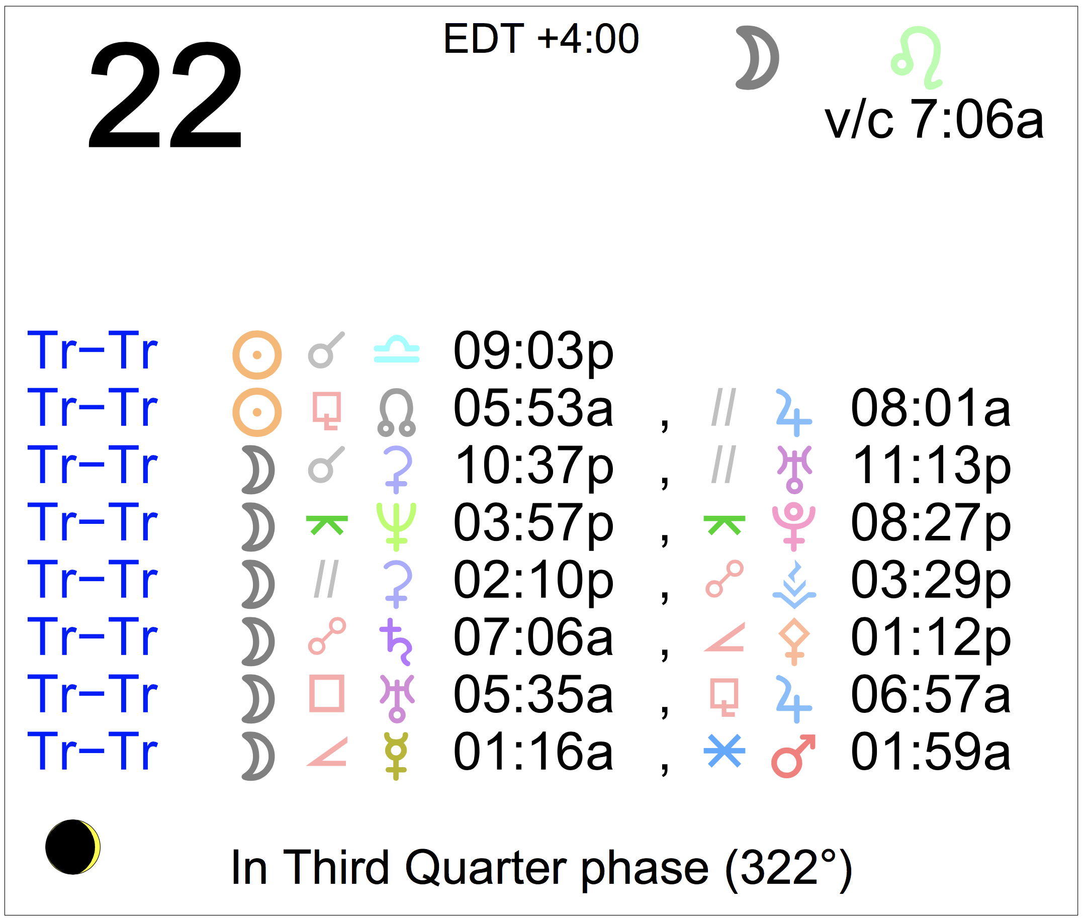 Planet Color Key: The longer the bar, the slower the aspecting planet, and the longer the duration of the planet’s transit.