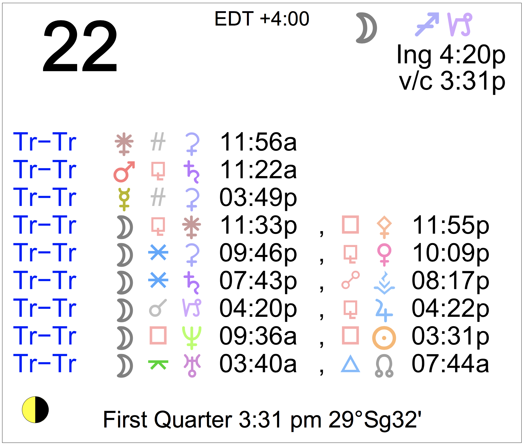 Planet Color Key: The longer the bar, the slower the aspecting planet, and the longer the duration of the planet’s transit.