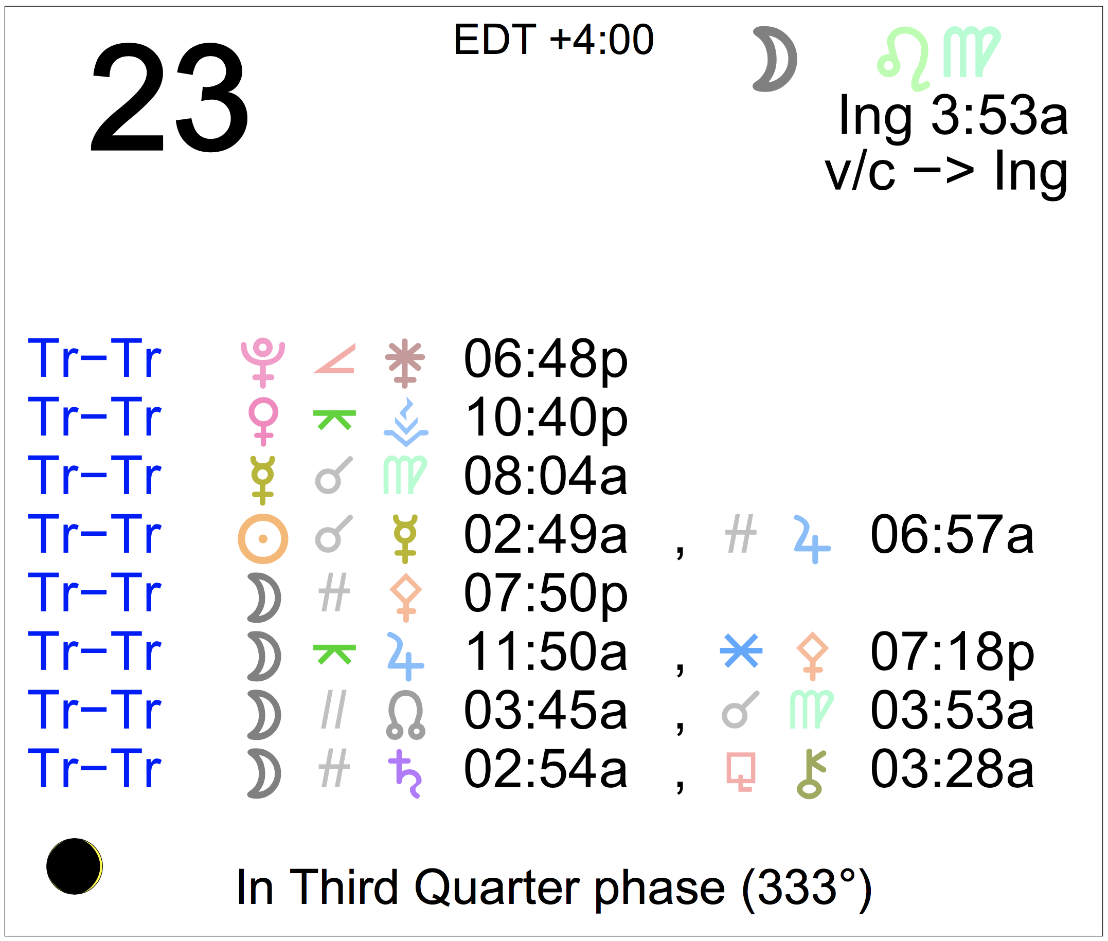Planet Color Key: The longer the bar, the slower the aspecting planet, and the longer the duration of the planet’s transit.