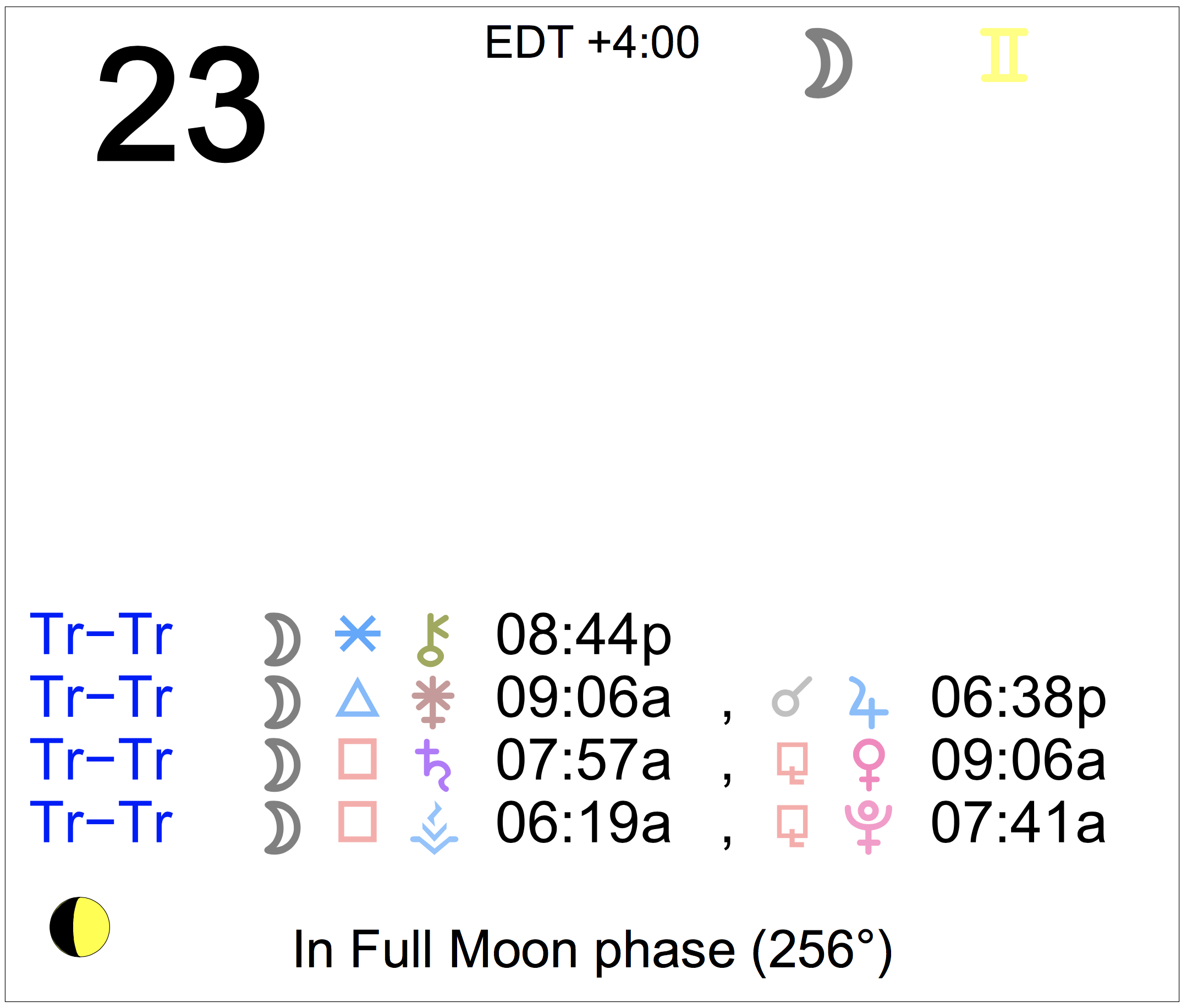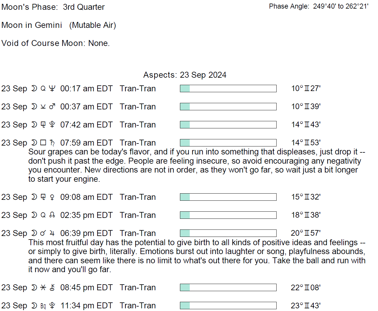 Planet Color Key: The longer the bar, the slower the aspecting planet, and the longer the duration of the planet’s transit.