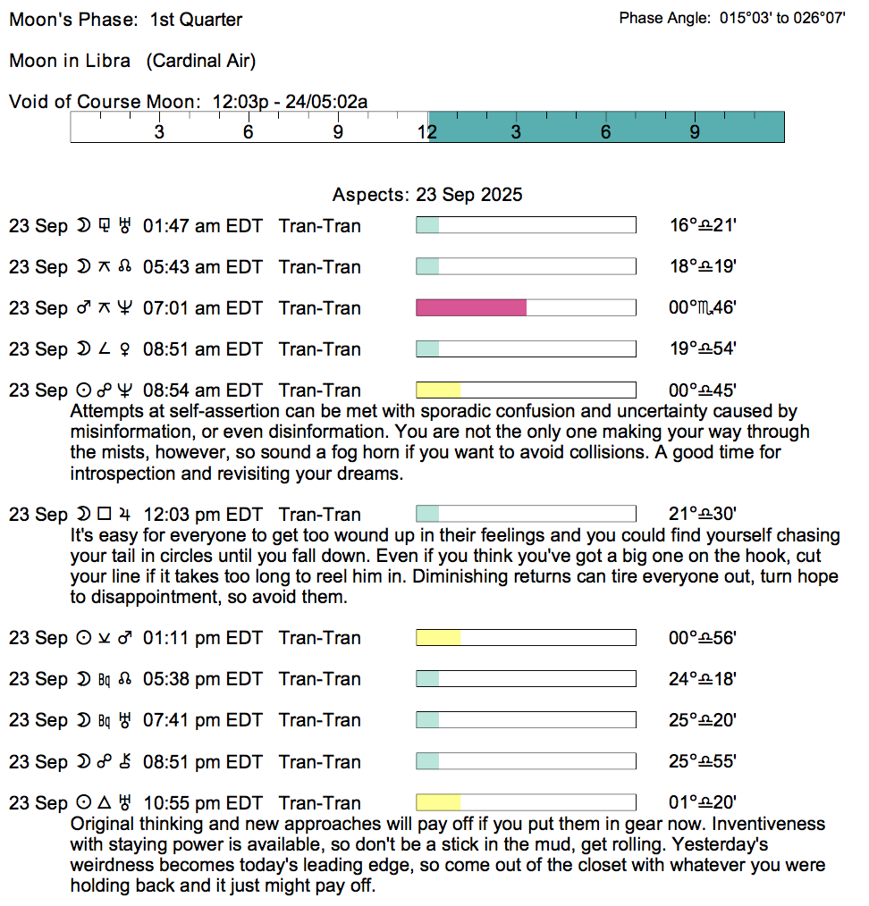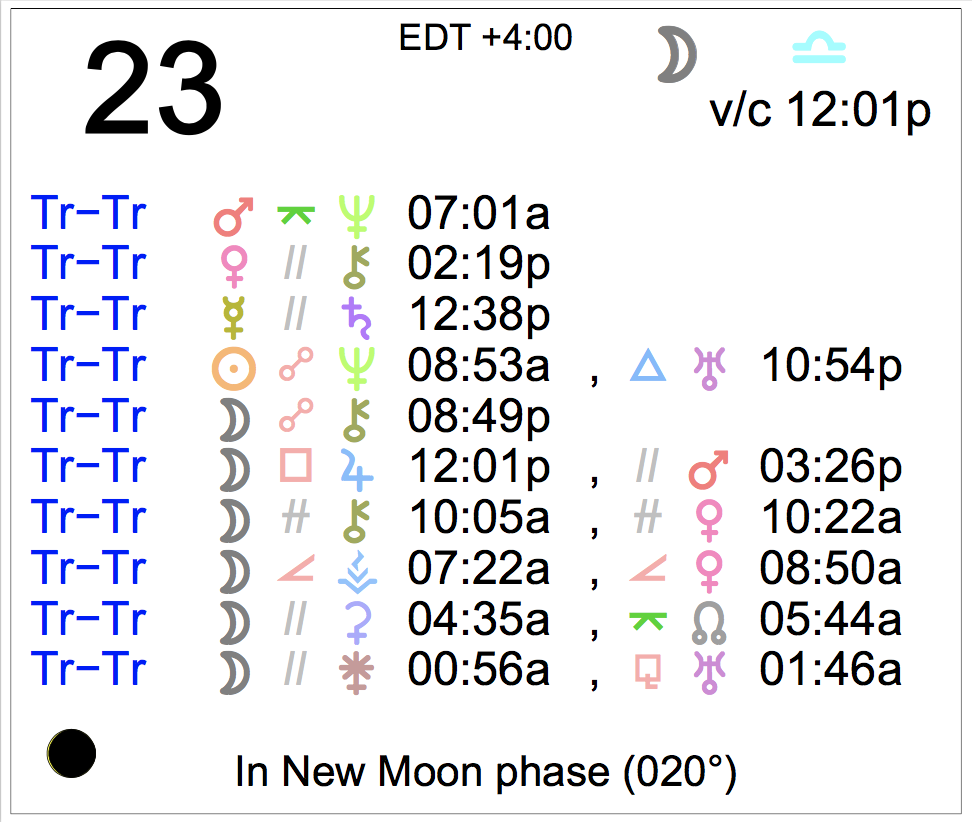 Planet Color Key: The longer the bar, the slower the aspecting planet, and the longer the duration of the planet’s transit.
