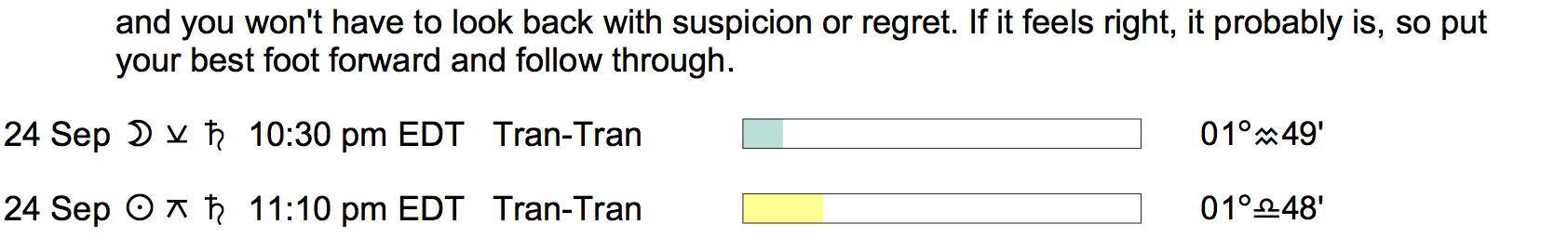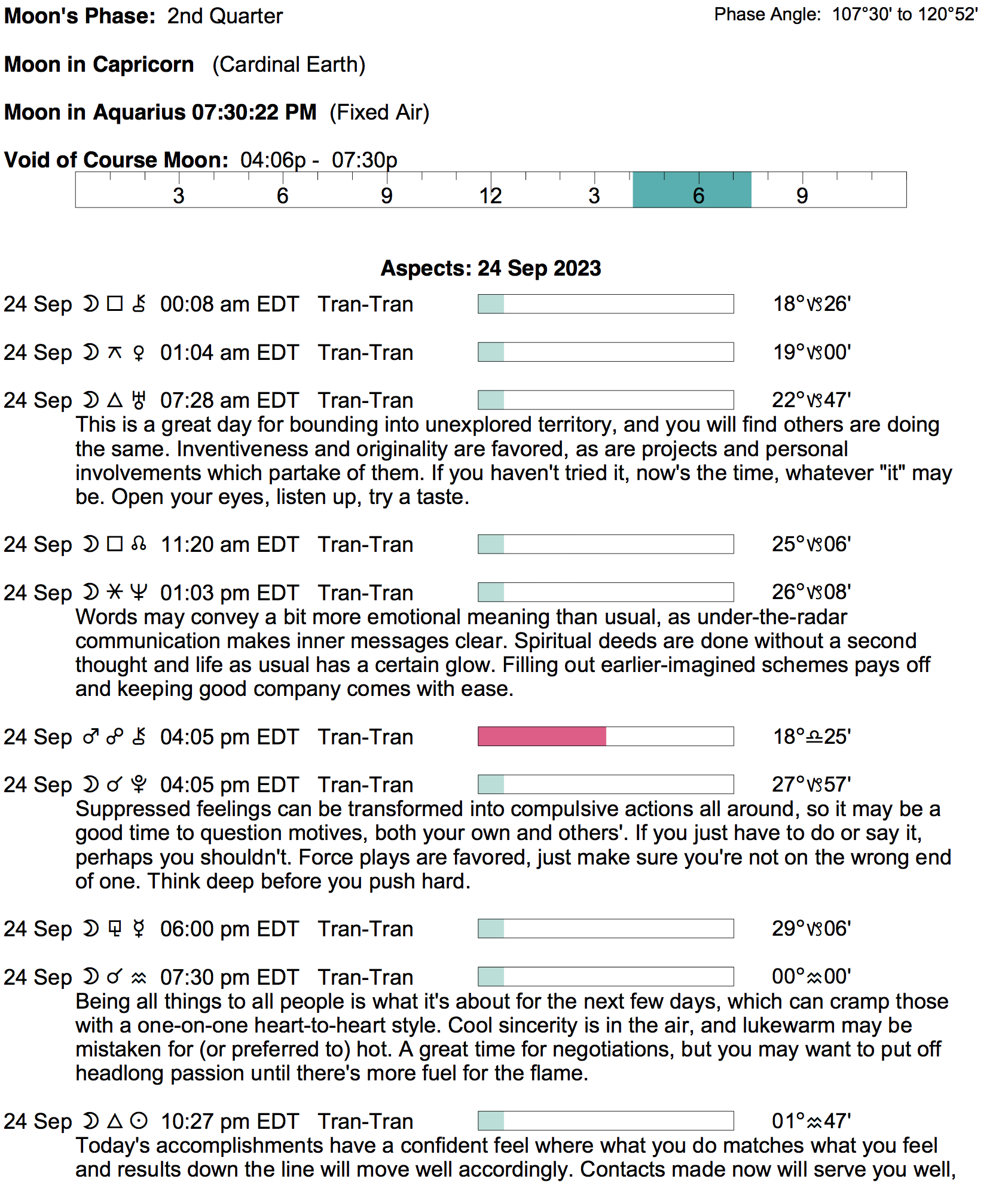 Planet Color Key: The longer the bar, the slower the aspecting planet, and the longer the duration of the planet’s transit.