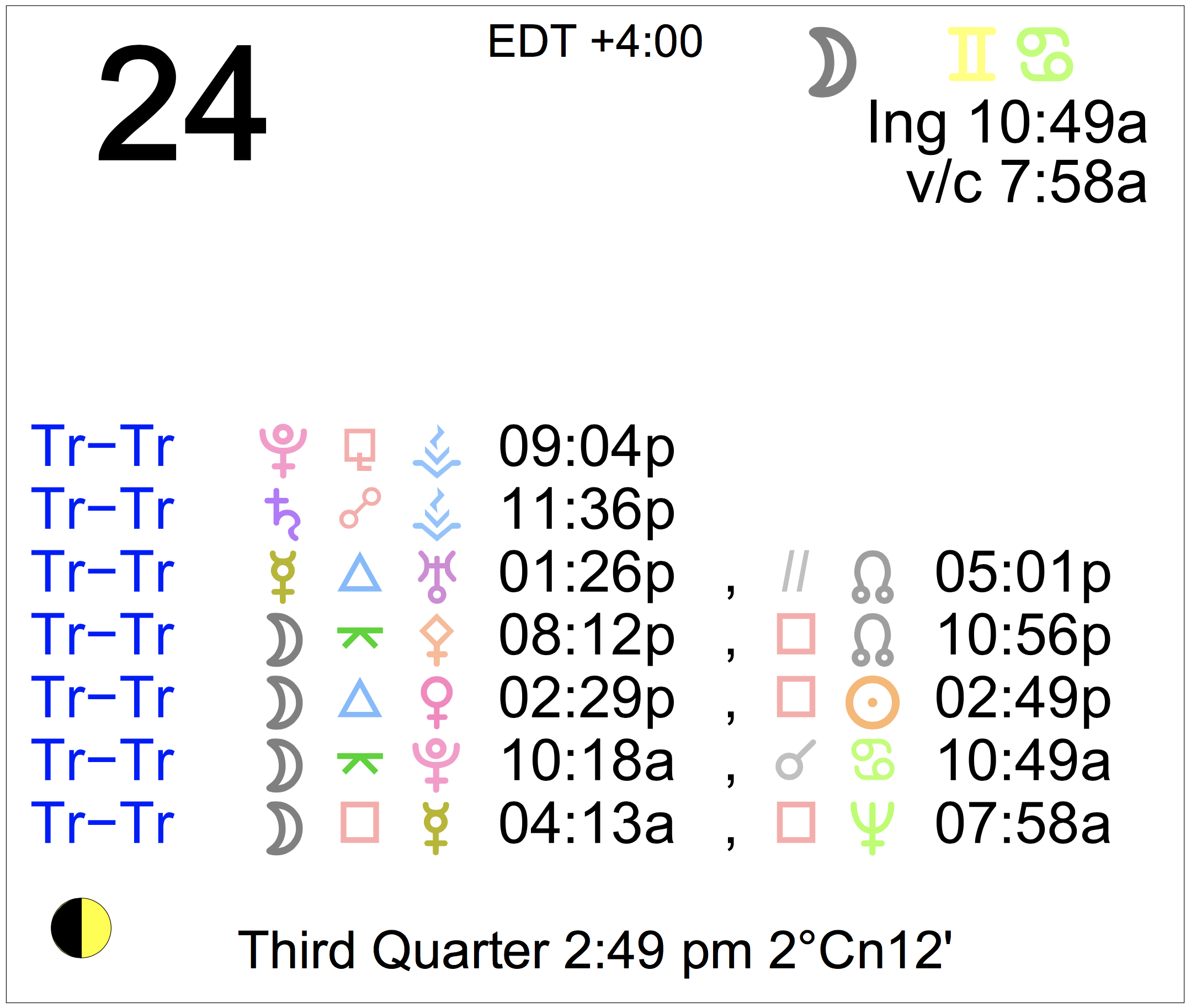 Planet Color Key: The longer the bar, the slower the aspecting planet, and the longer the duration of the planet’s transit.