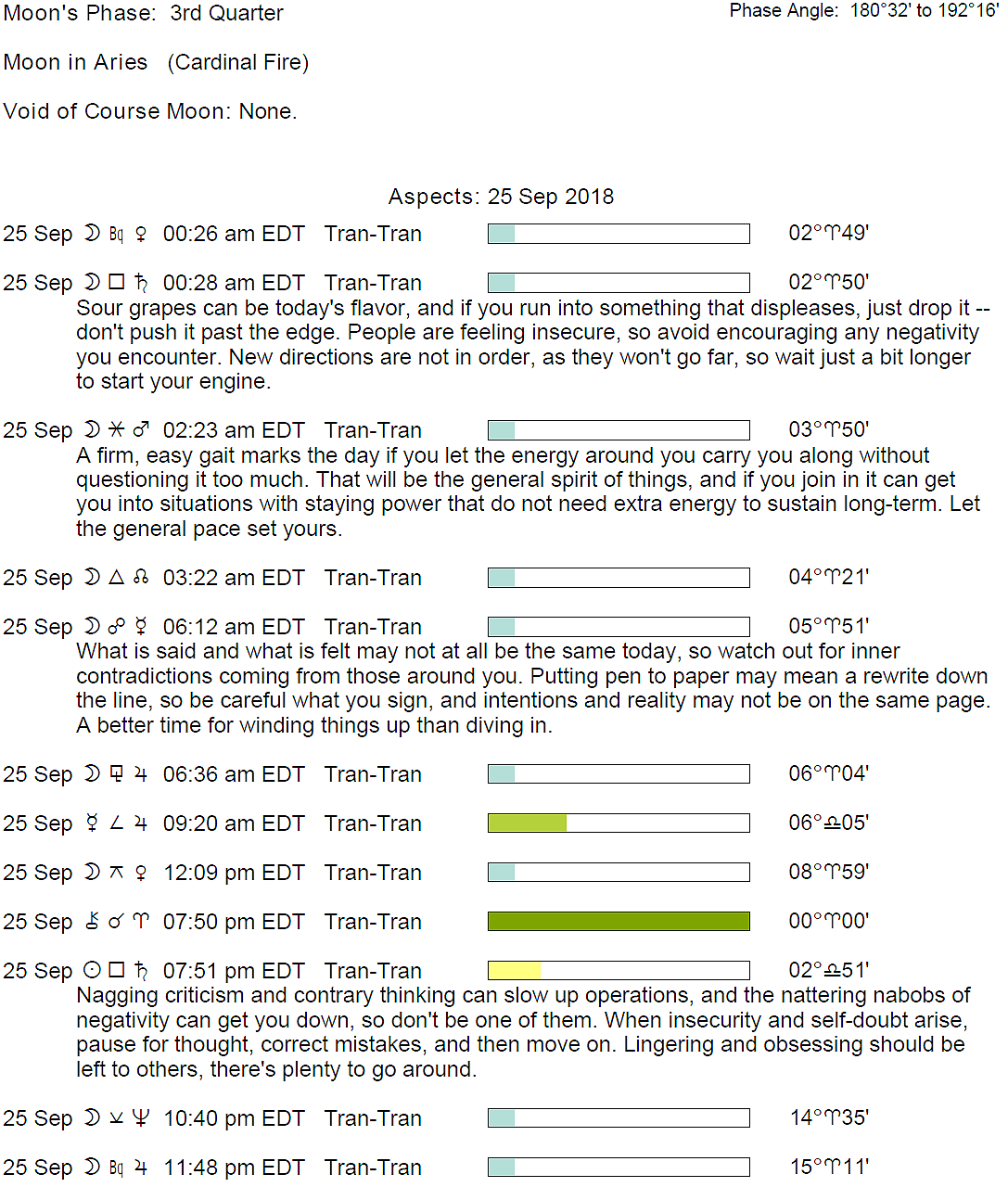 Planet Color Key: The longer the bar, the slower the aspecting planet and the longer the duration of the planet’s transit.