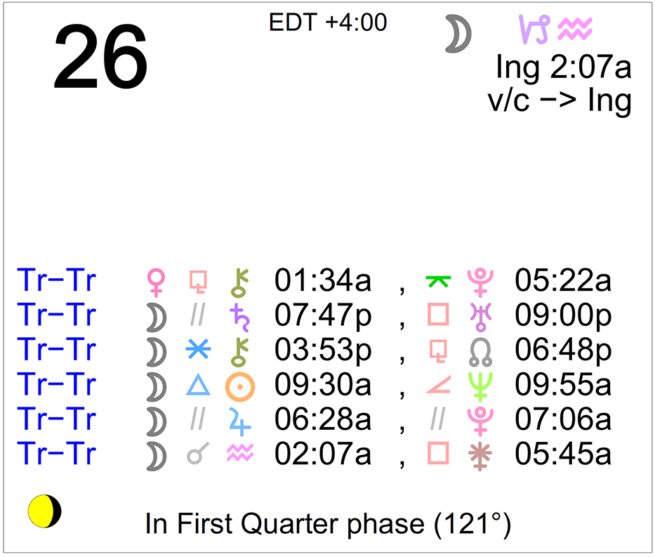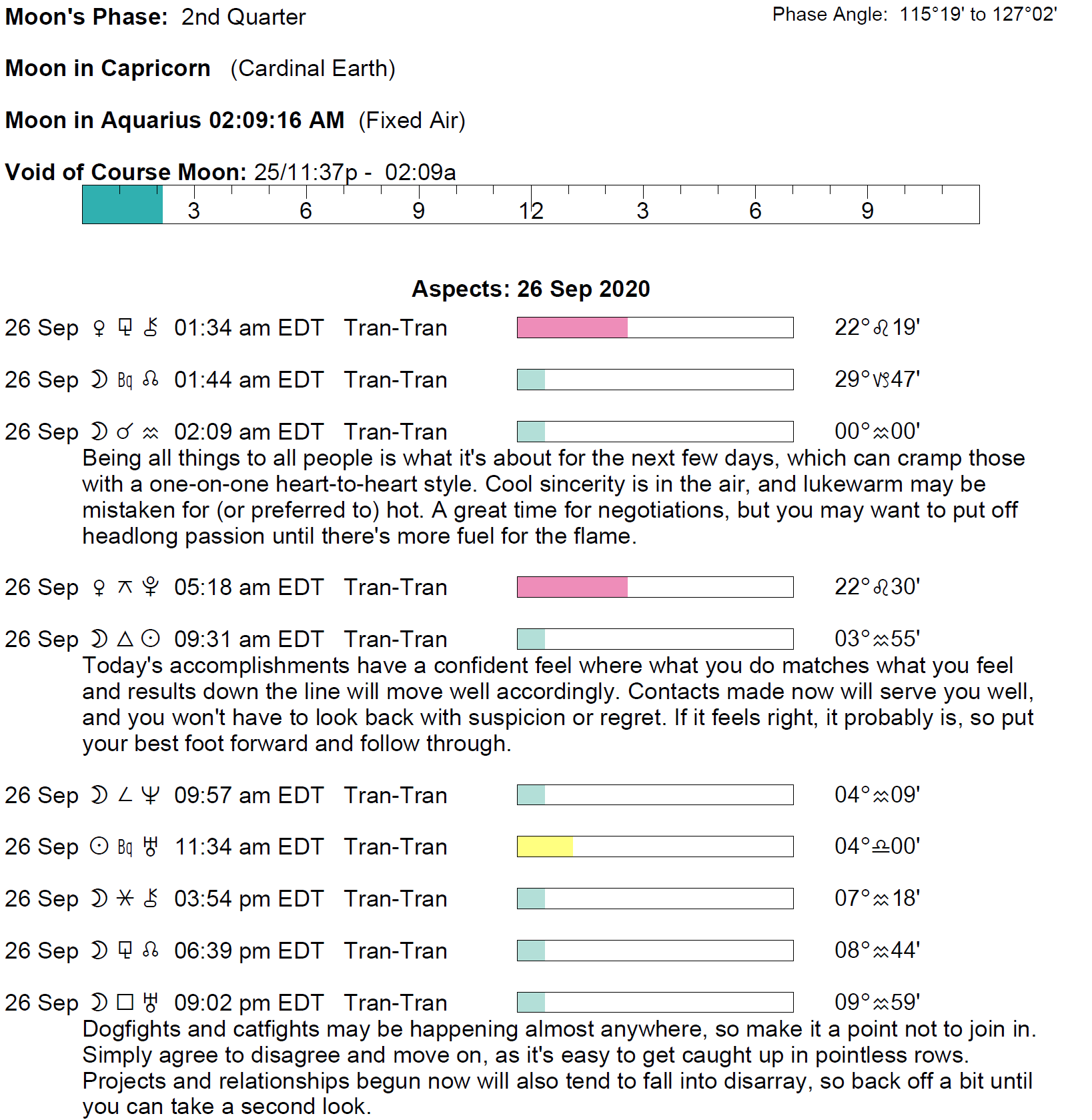 Planet Color Key: The longer the bar, the slower the aspecting planet and the longer the duration of the planet’s transit.