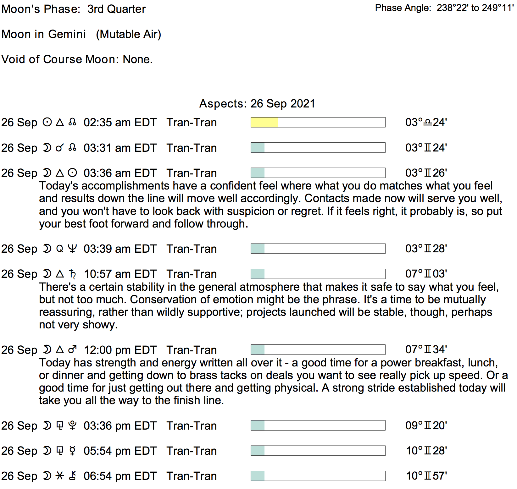 Planet Color Key: The longer the bar, the slower the aspecting planet, and the longer the duration of the planet’s transit.