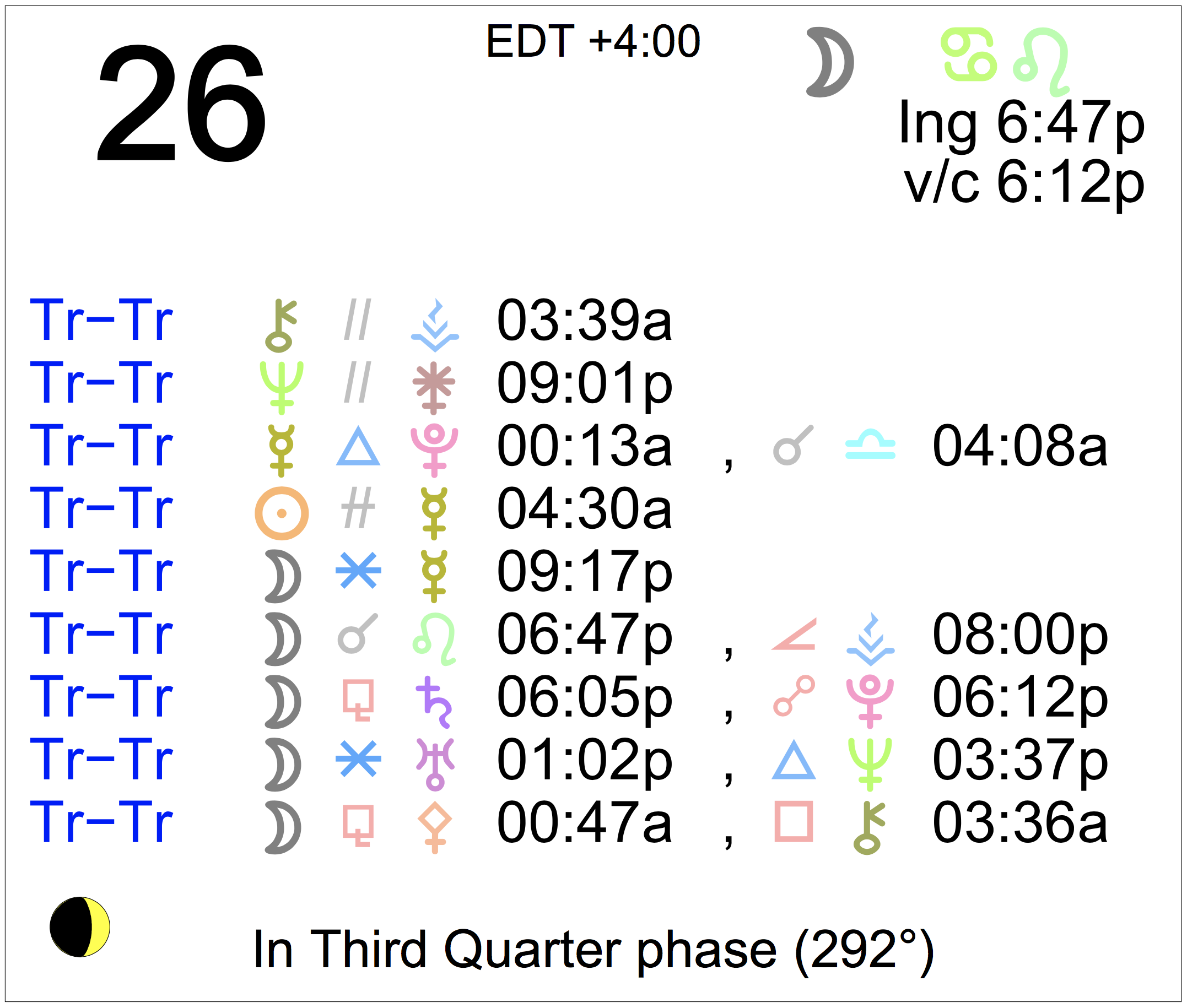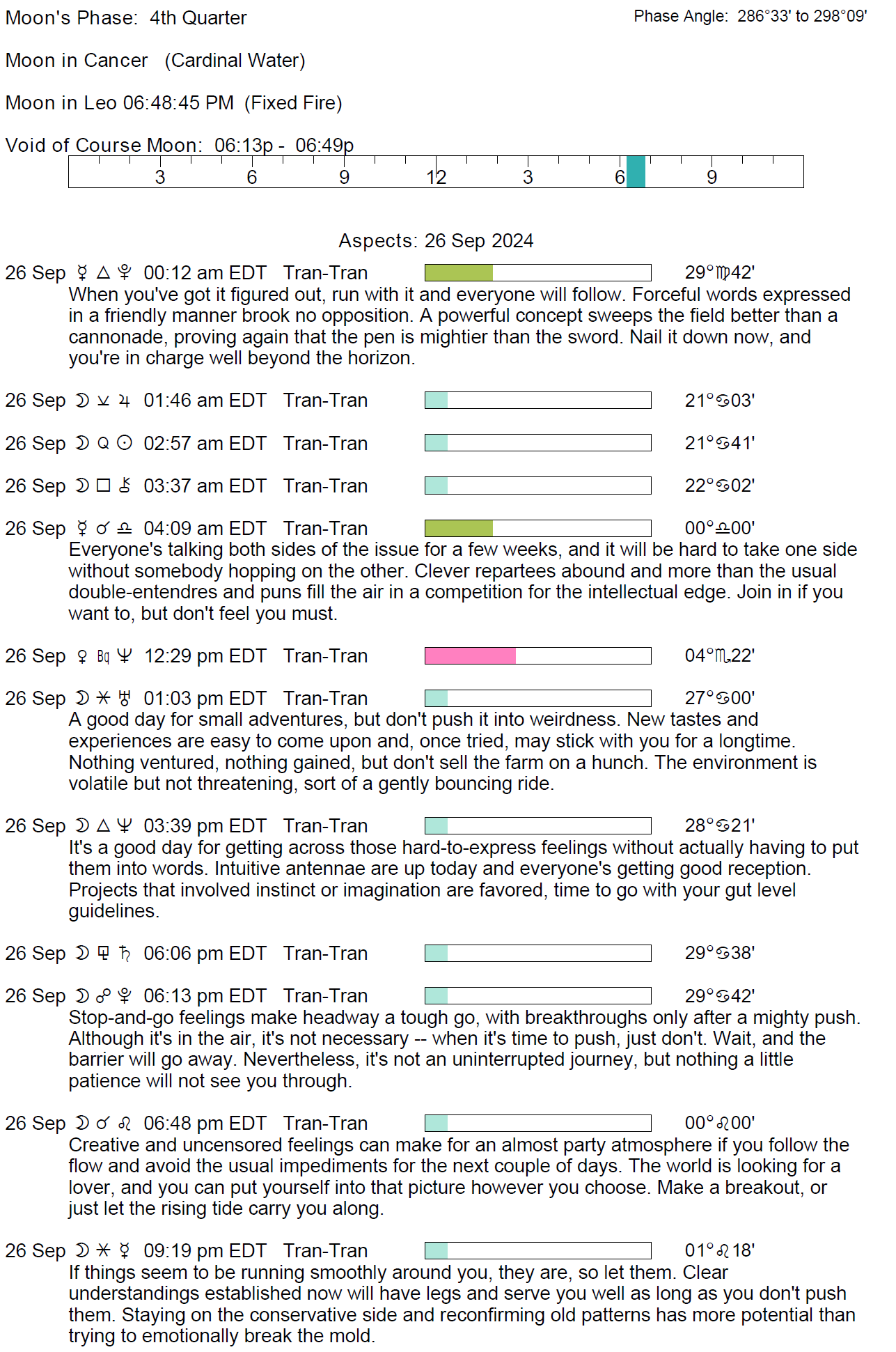 Planet Color Key: The longer the bar, the slower the aspecting planet, and the longer the duration of the planet’s transit.