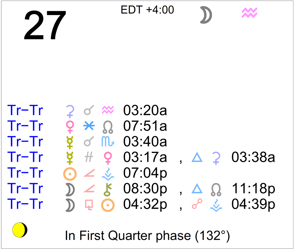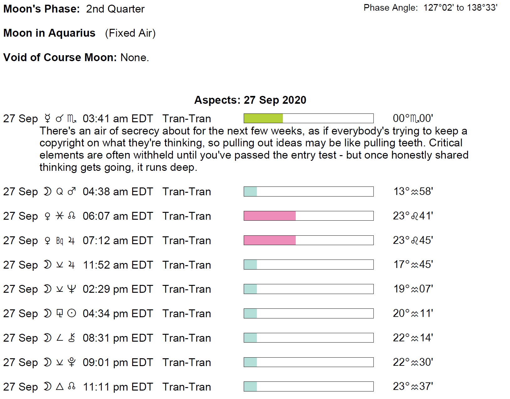 Planet Color Key: The longer the bar, the slower the aspecting planet and the longer the duration of the planet’s transit.