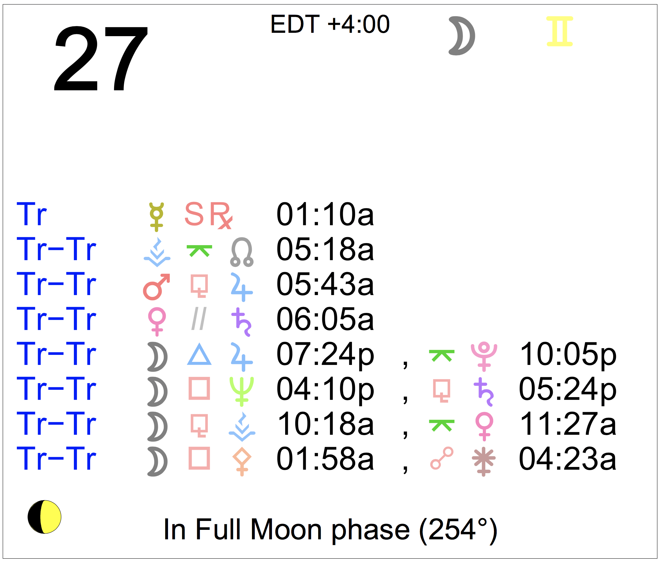 Planet Color Key: The longer the bar, the slower the aspecting planet, and the longer the duration of the planet’s transit.