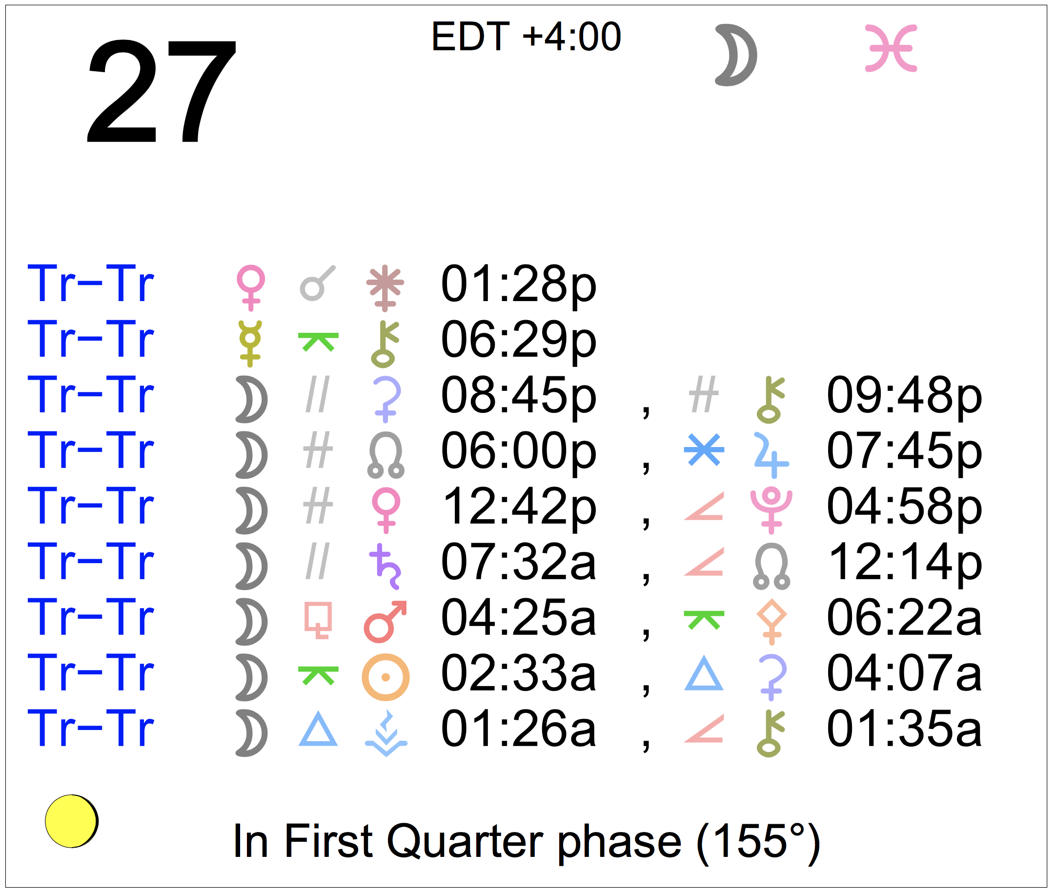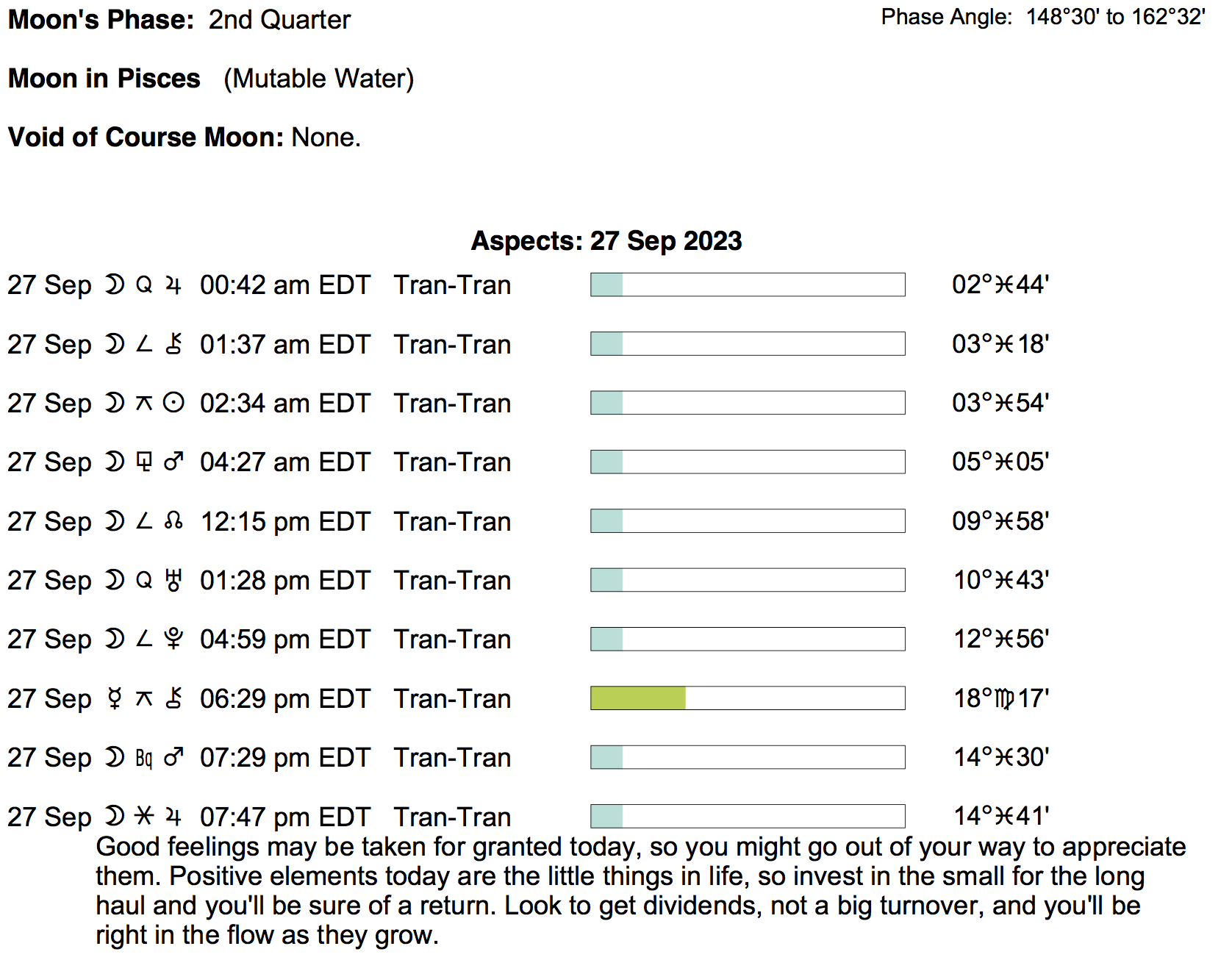 Planet Color Key: The longer the bar, the slower the aspecting planet, and the longer the duration of the planet’s transit.