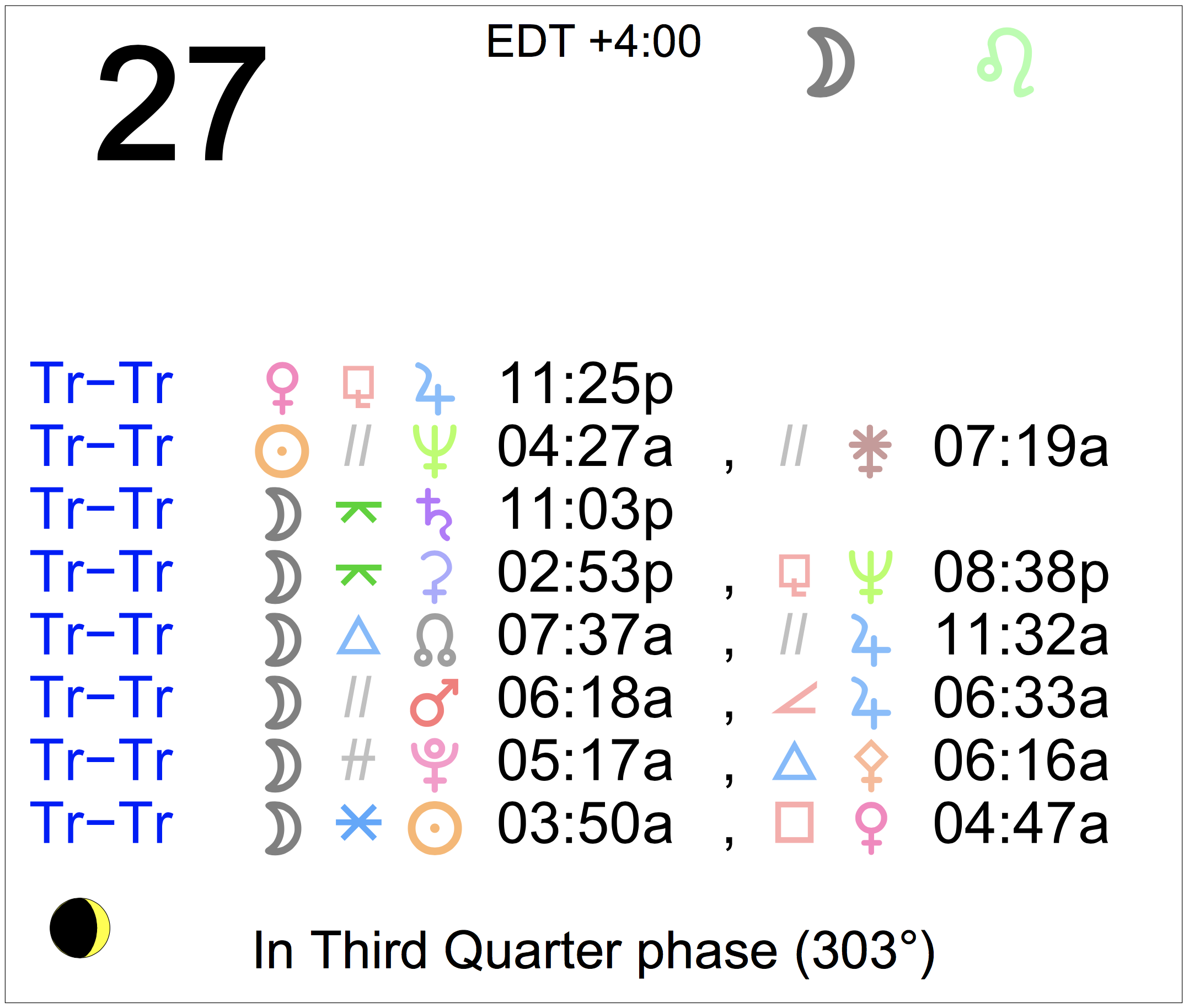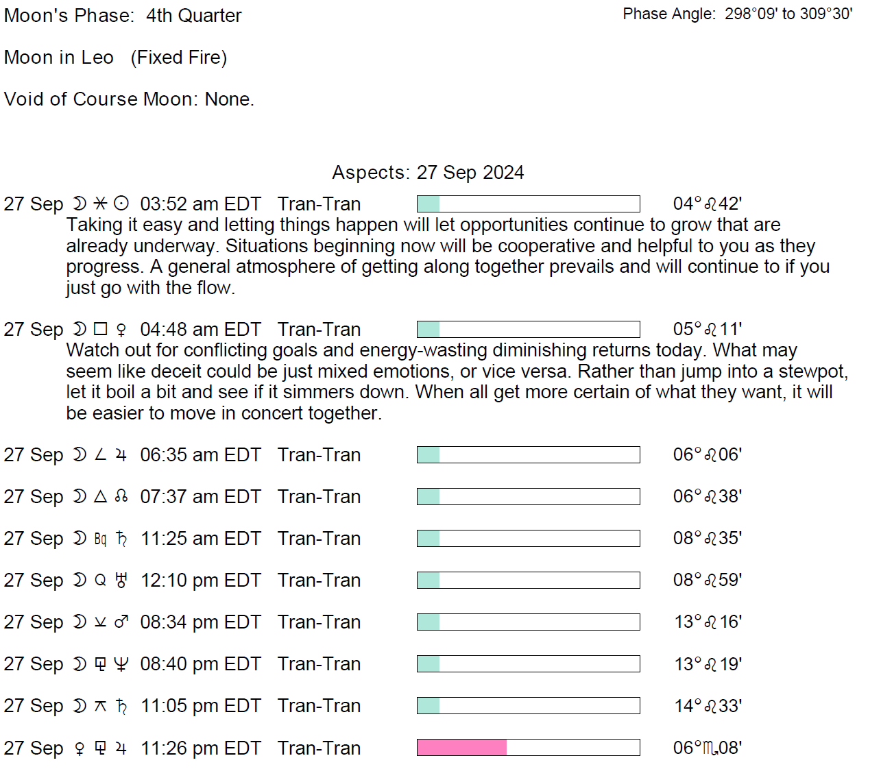Planet Color Key: The longer the bar, the slower the aspecting planet, and the longer the duration of the planet’s transit.