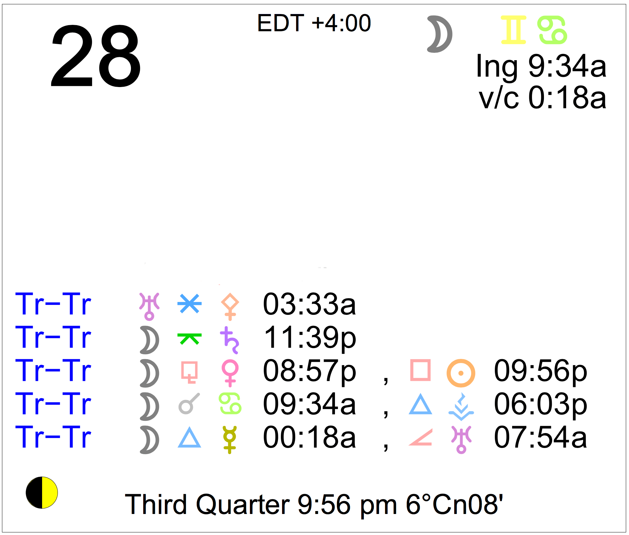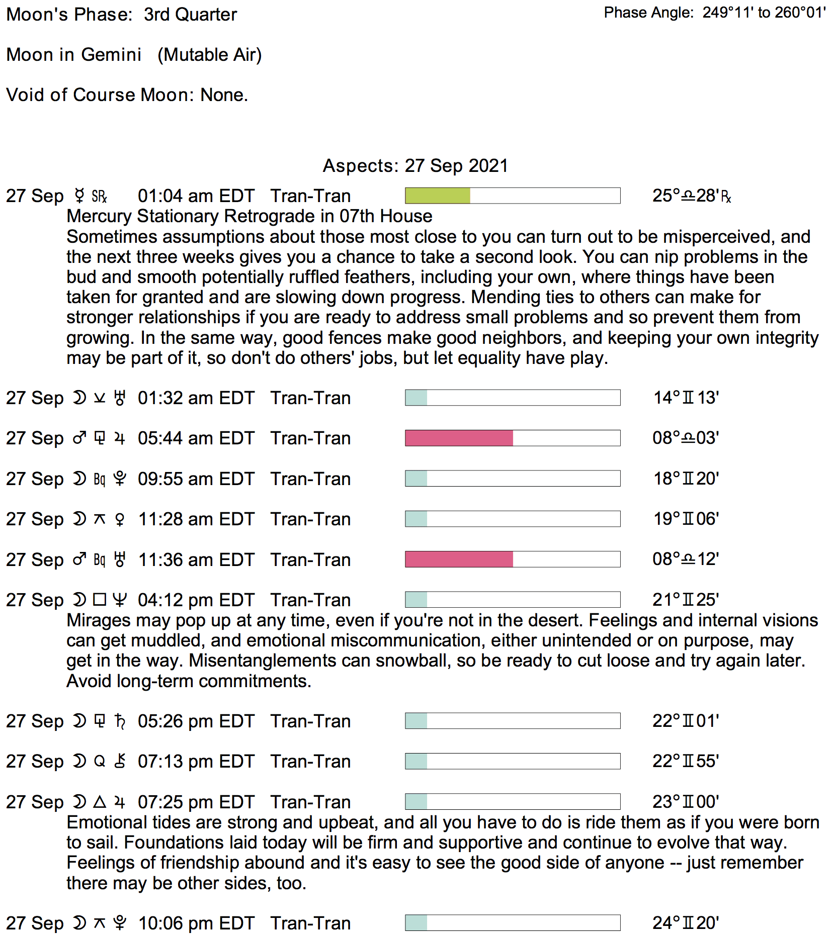 Planet Color Key: The longer the bar, the slower the aspecting planet, and the longer the duration of the planet’s transit.