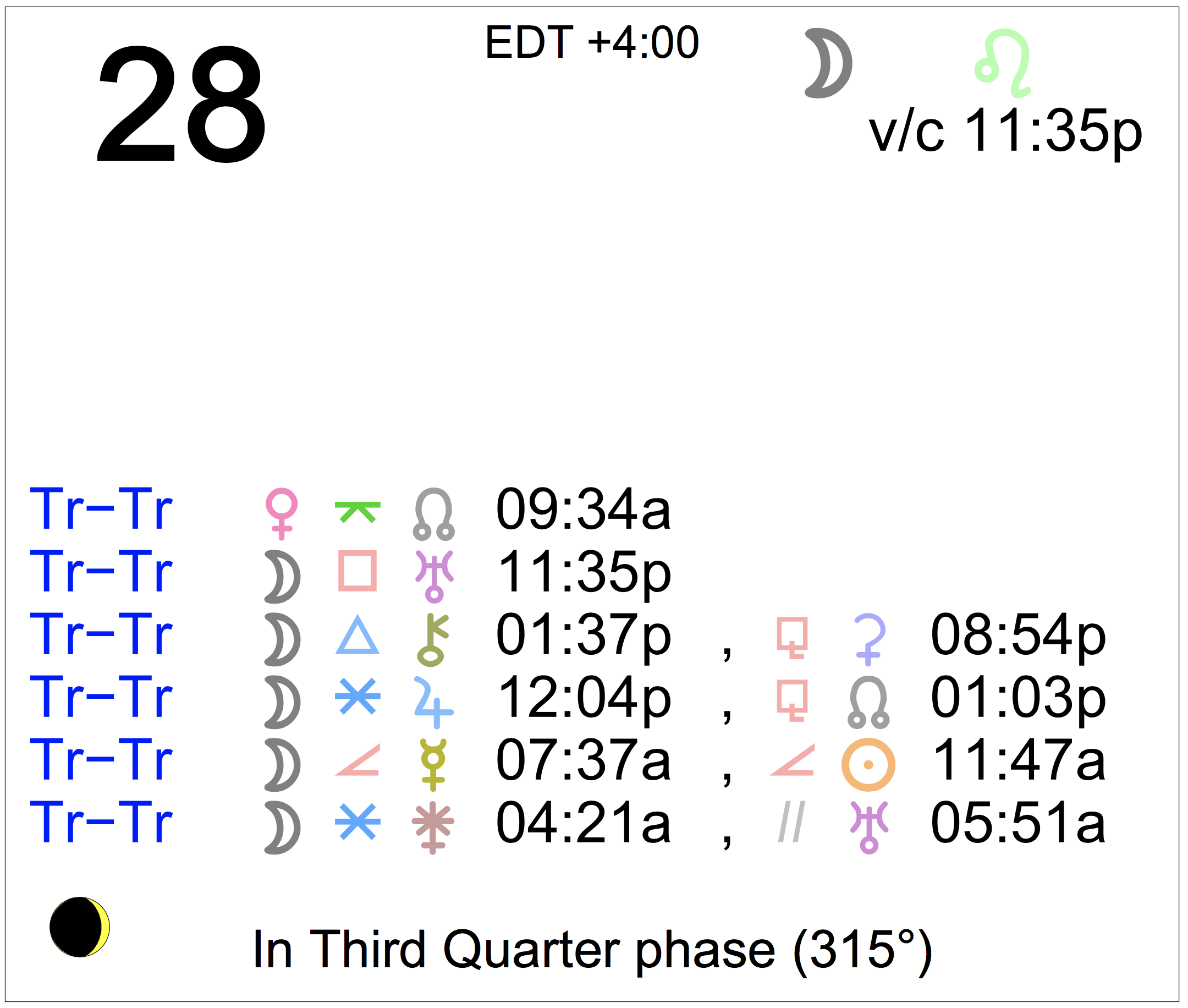 Planet Color Key: The longer the bar, the slower the aspecting planet, and the longer the duration of the planet’s transit.