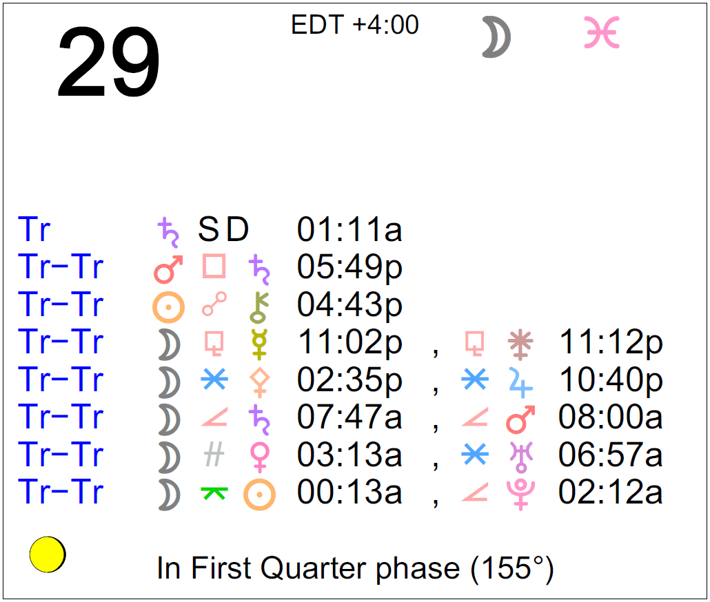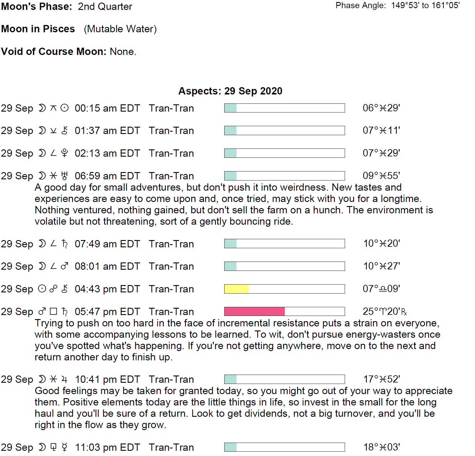 Planet Color Key: The longer the bar, the slower the aspecting planet and the longer the duration of the planet’s transit.