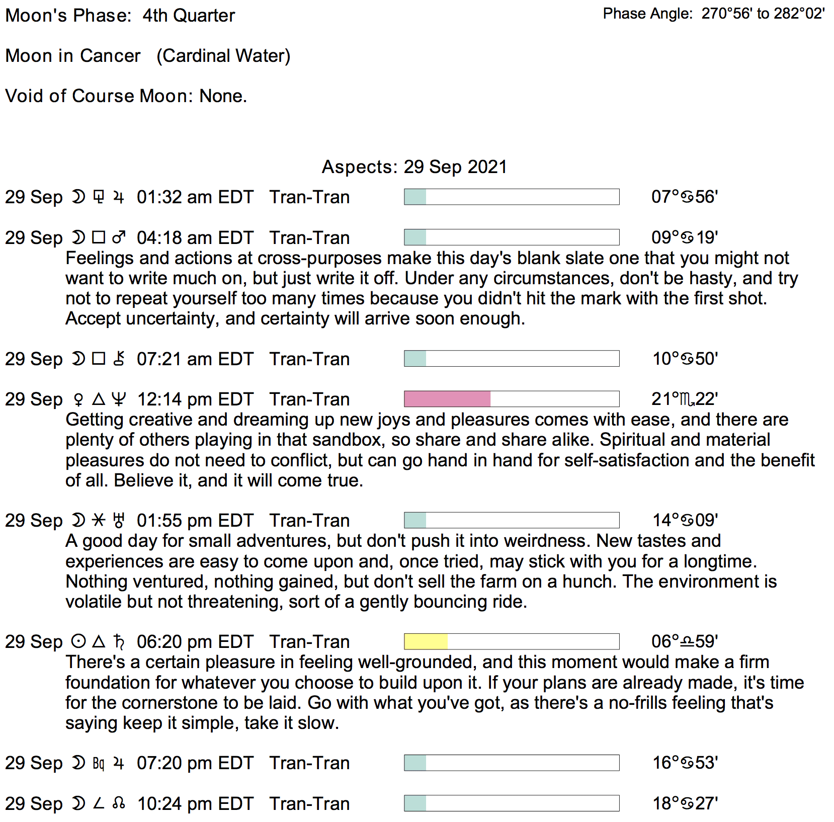 Planet Color Key: The longer the bar, the slower the aspecting planet, and the longer the duration of the planet’s transit.
