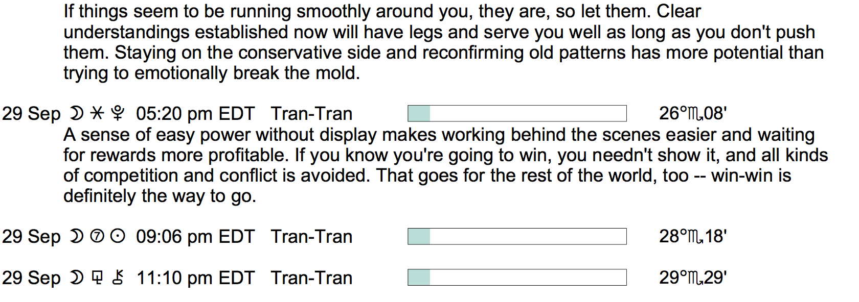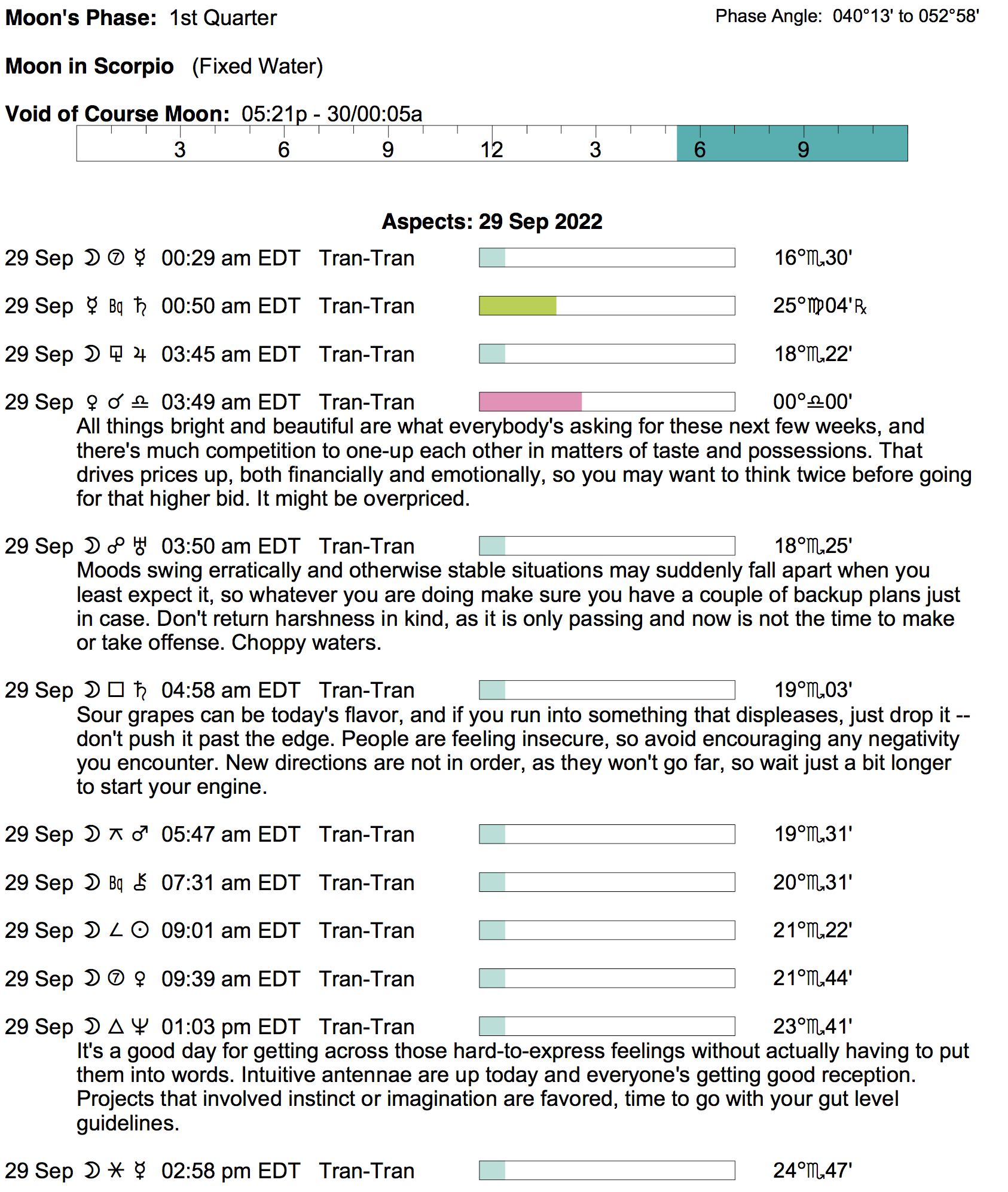 Planet Color Key: The longer the bar, the slower the aspecting planet, and the longer the duration of the planet’s transit.