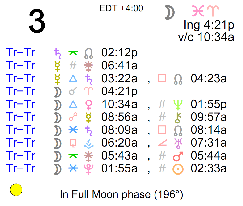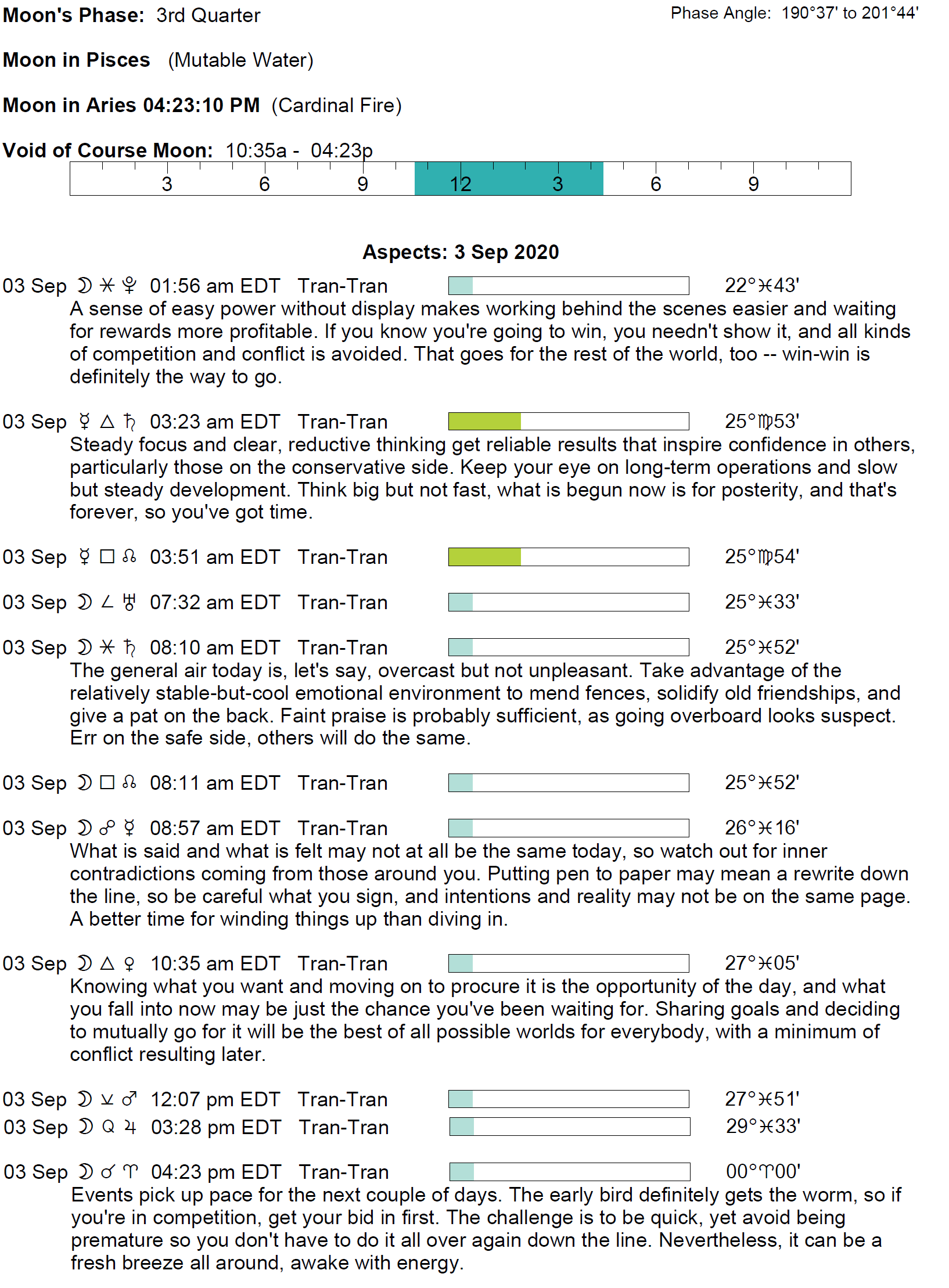 Planet Color Key: The longer the bar, the slower the aspecting planet and the longer the duration of the planet’s transit.
