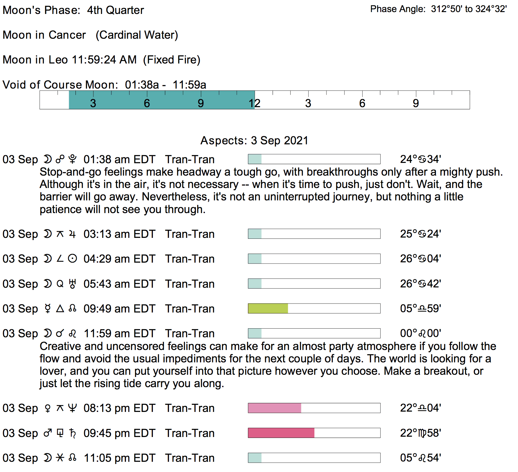 Planet Color Key: The longer the bar, the slower the aspecting planet, and the longer the duration of the planet’s transit.