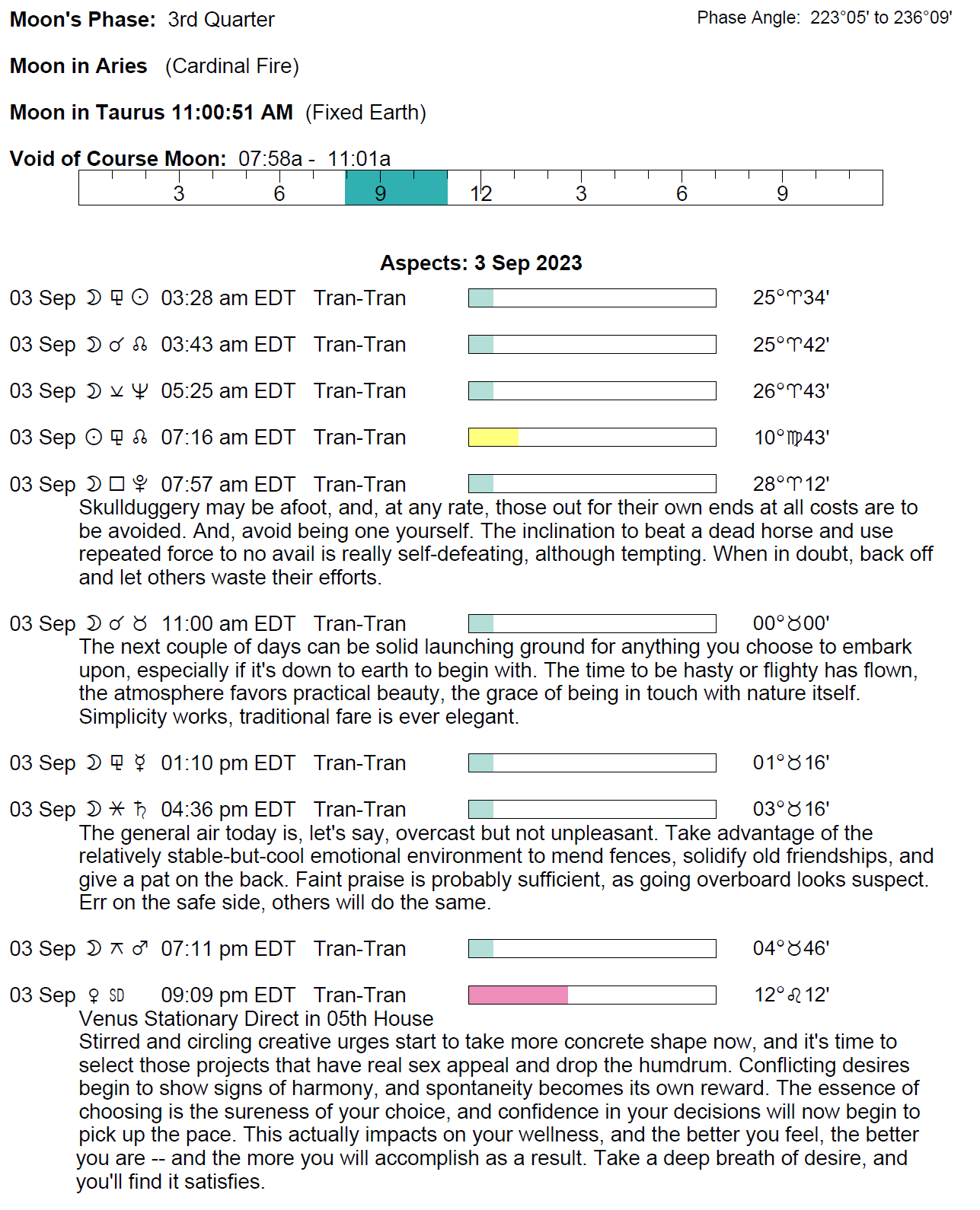 Planet Color Key: The longer the bar, the slower the aspecting planet, and the longer the duration of the planet’s transit.
