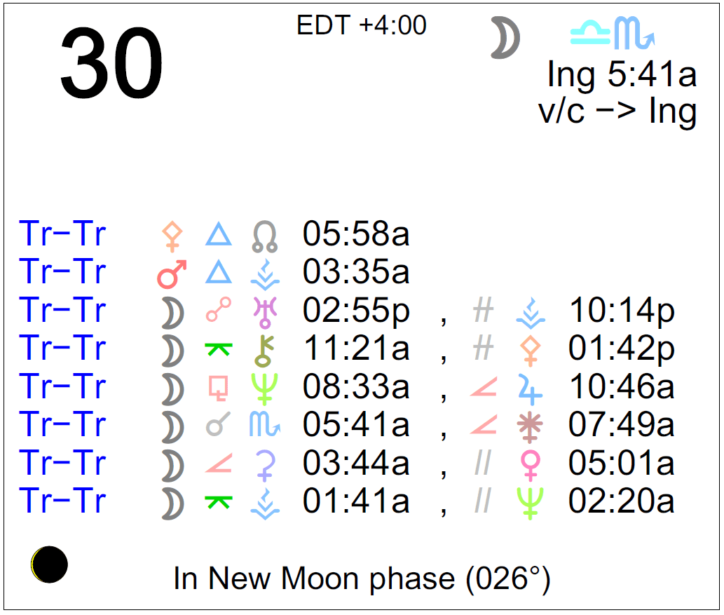 - The Moon is in Libra until 5:41 AM, after which the Moon transits Scorpio.