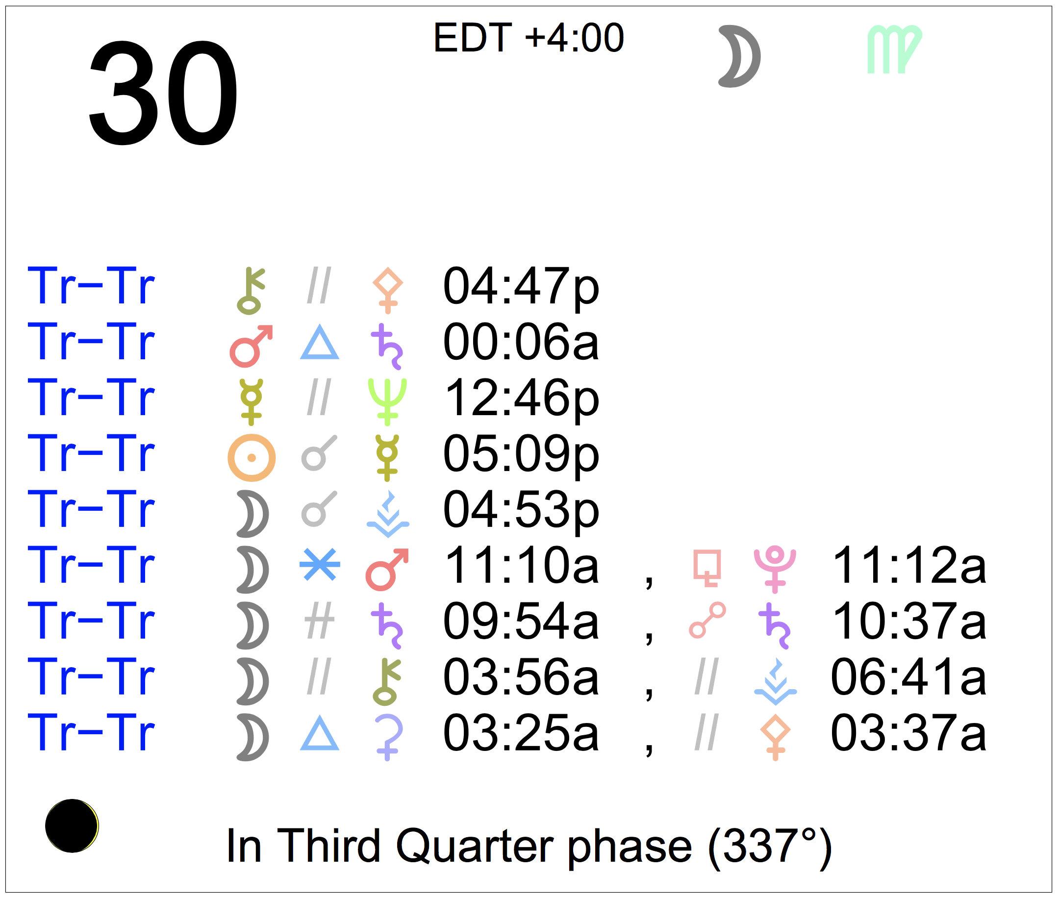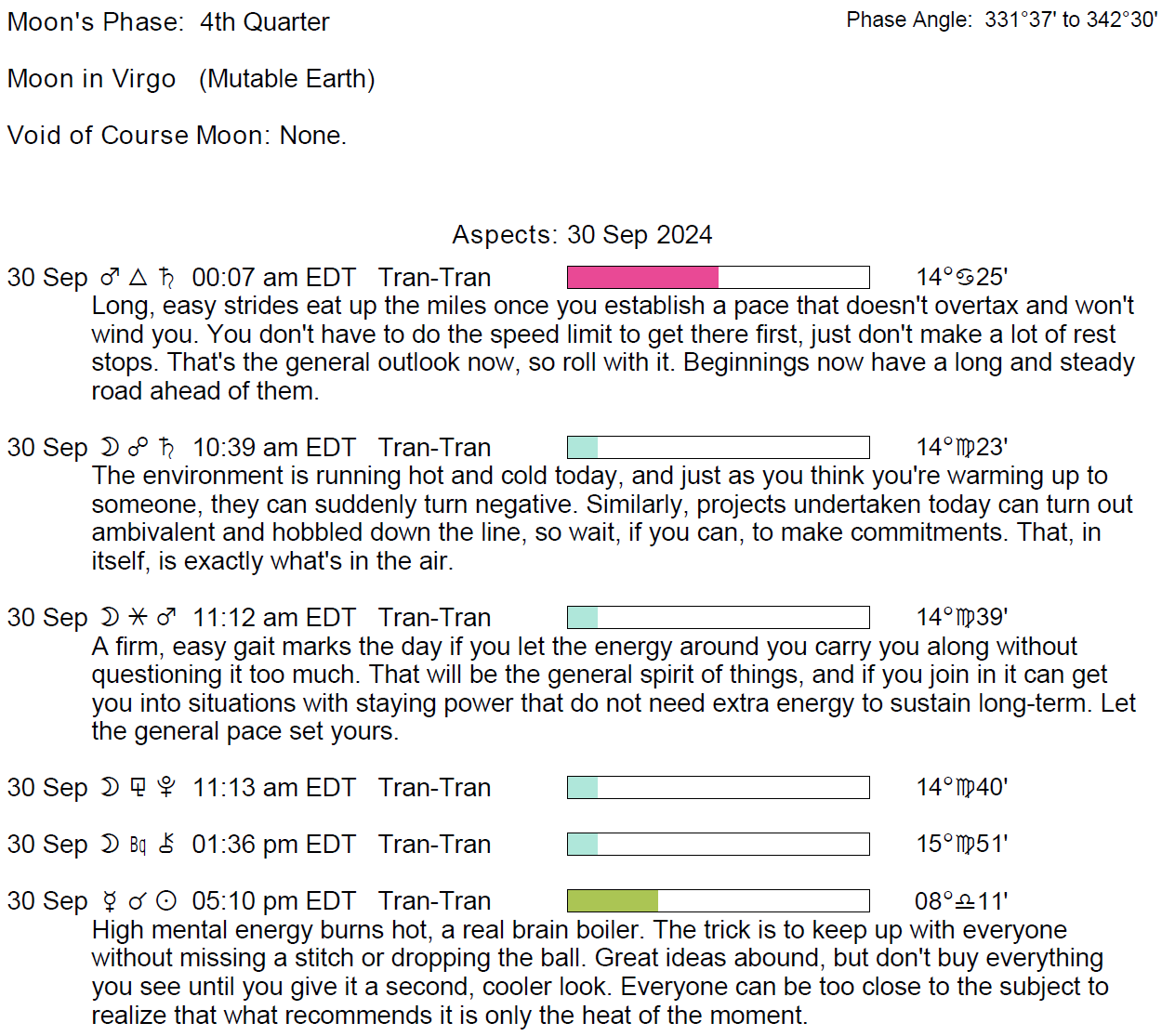 Planet Color Key: The longer the bar, the slower the aspecting planet, and the longer the duration of the planet’s transit.