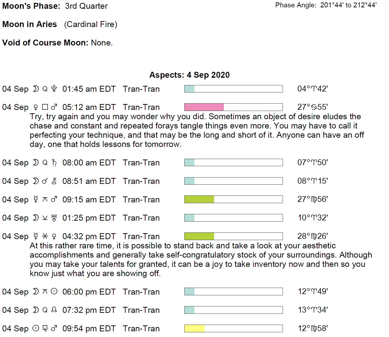 Planet Color Key: The longer the bar, the slower the aspecting planet and the longer the duration of the planet’s transit.