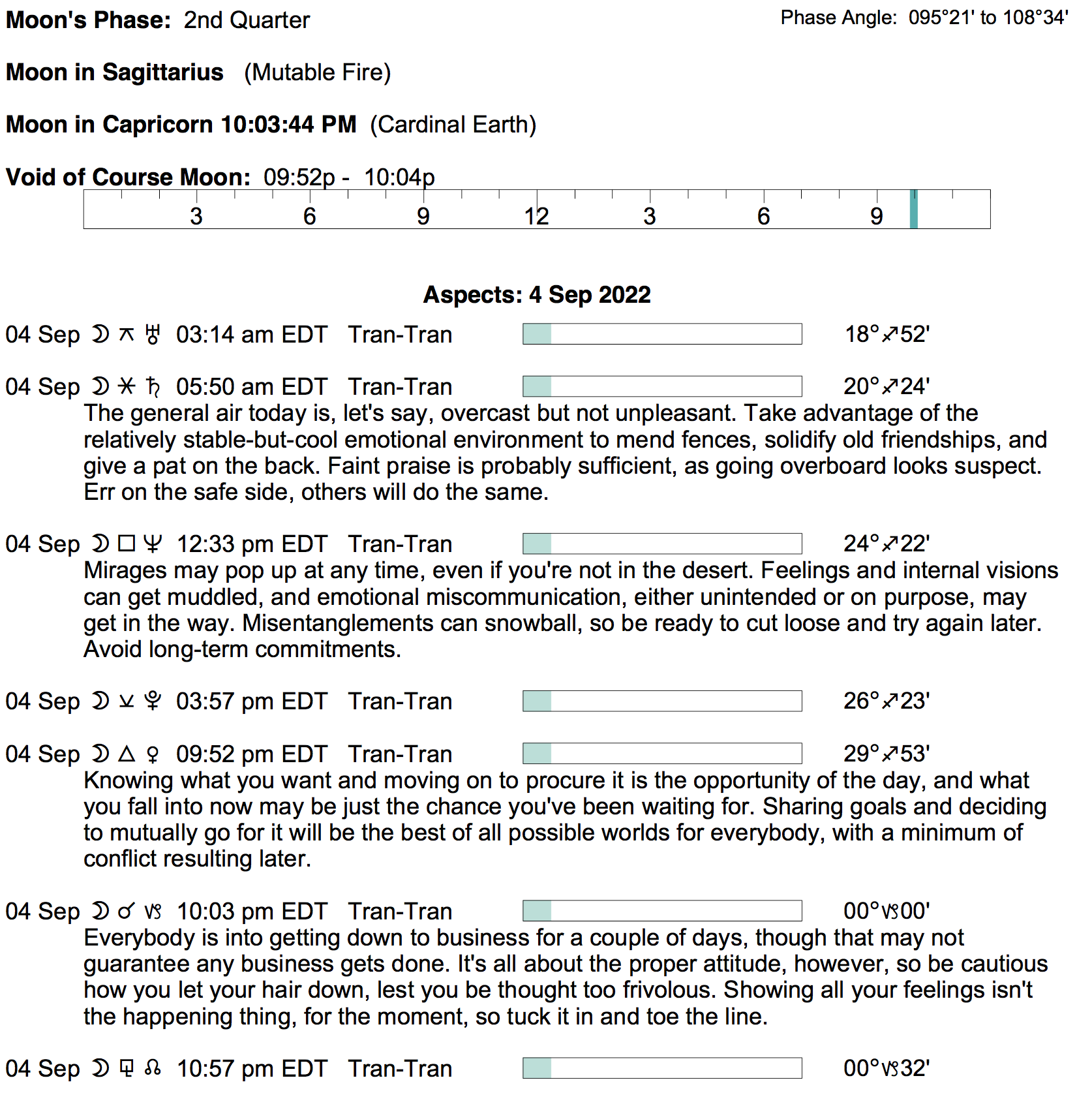 - A void Moon period occurs from 9:50 PM to 10:02 PM today.