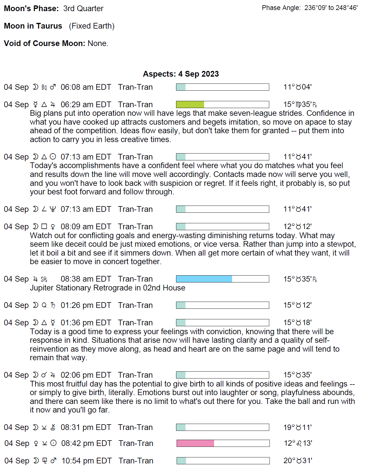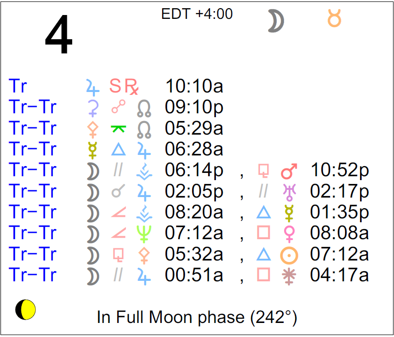 Planet Color Key: The longer the bar, the slower the aspecting planet, and the longer the duration of the planet’s transit.