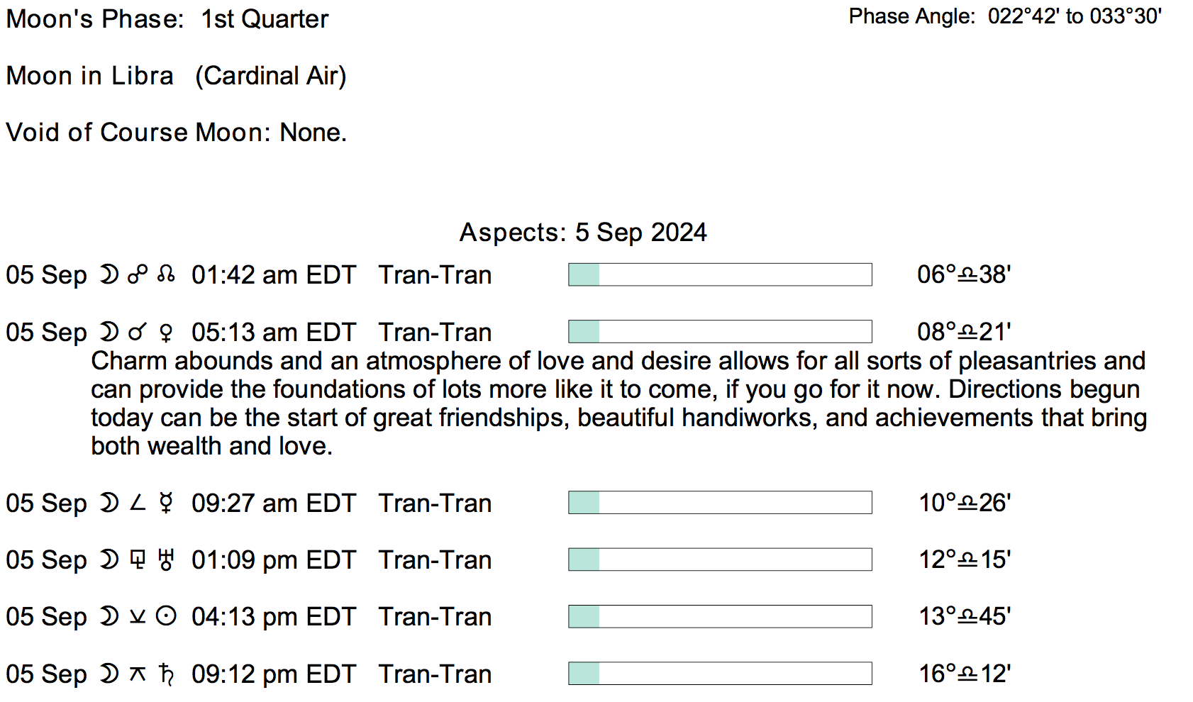 Planet Color Key: The longer the bar, the slower the aspecting planet, and the longer the duration of the planet’s transit.