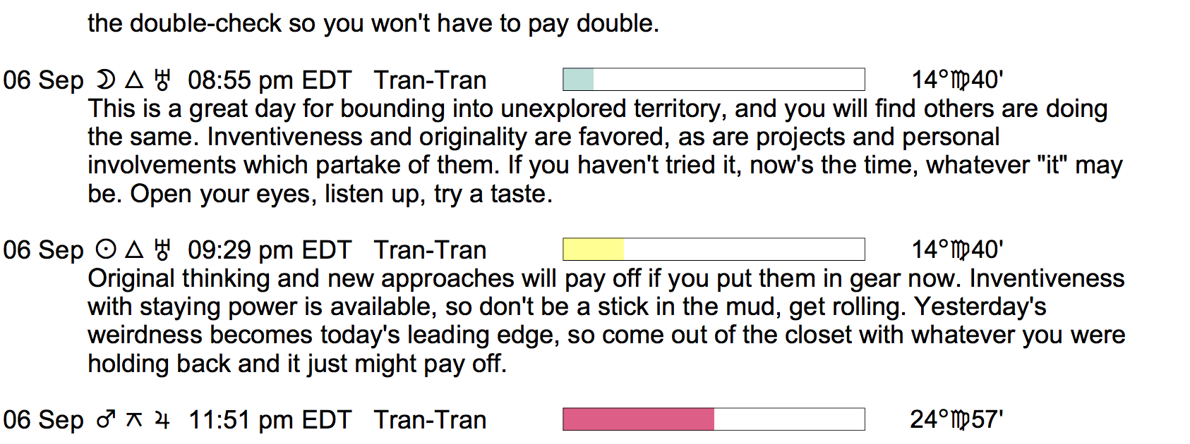 Planet Color Key: The longer the bar, the slower the aspecting planet, and the longer the duration of the planet’s transit.