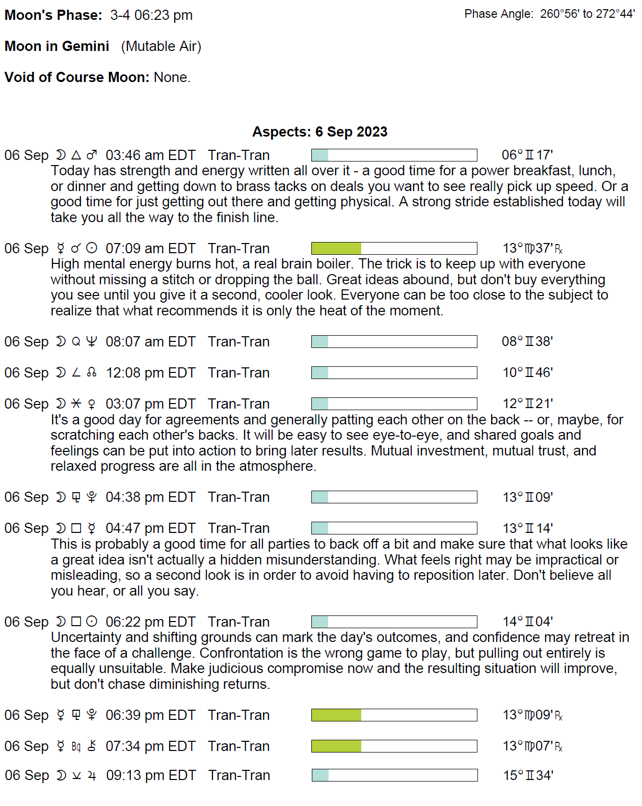 Planet Color Key: The longer the bar, the slower the aspecting planet, and the longer the duration of the planet’s transit.