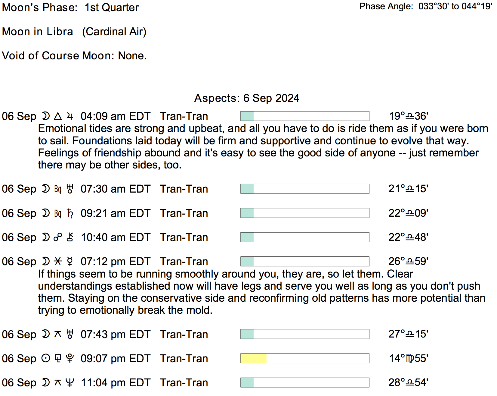 Planet Color Key: The longer the bar, the slower the aspecting planet, and the longer the duration of the planet’s transit.