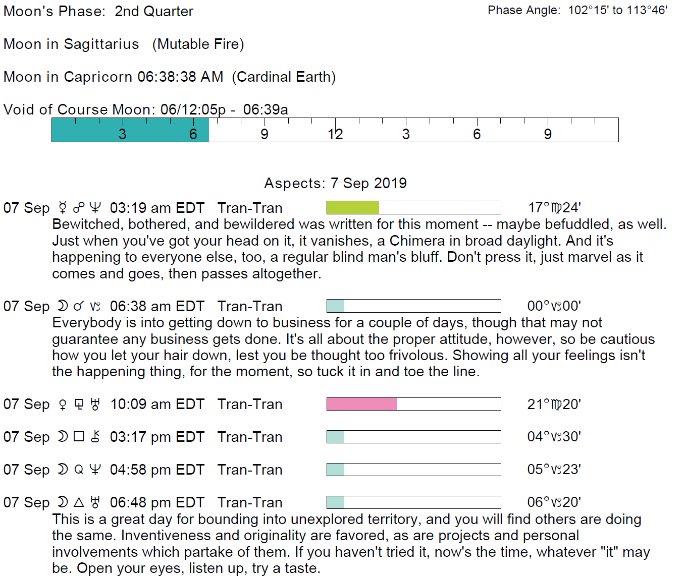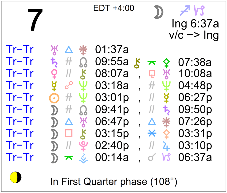Planet Color Key: The longer the bar, the slower the aspecting planet and the longer the duration of the planet’s transit.