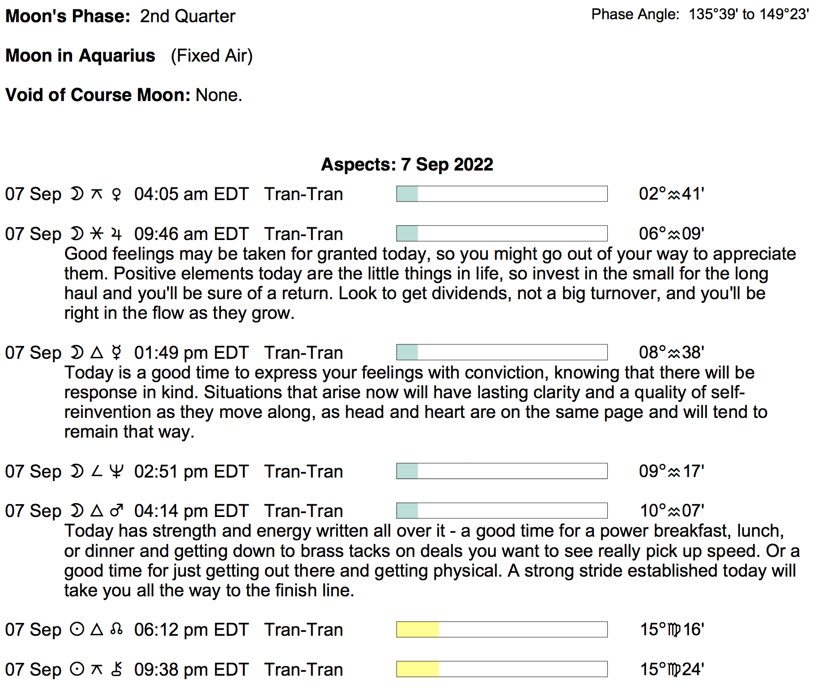 Planet Color Key: The longer the bar, the slower the aspecting planet, and the longer the duration of the planet’s transit.
