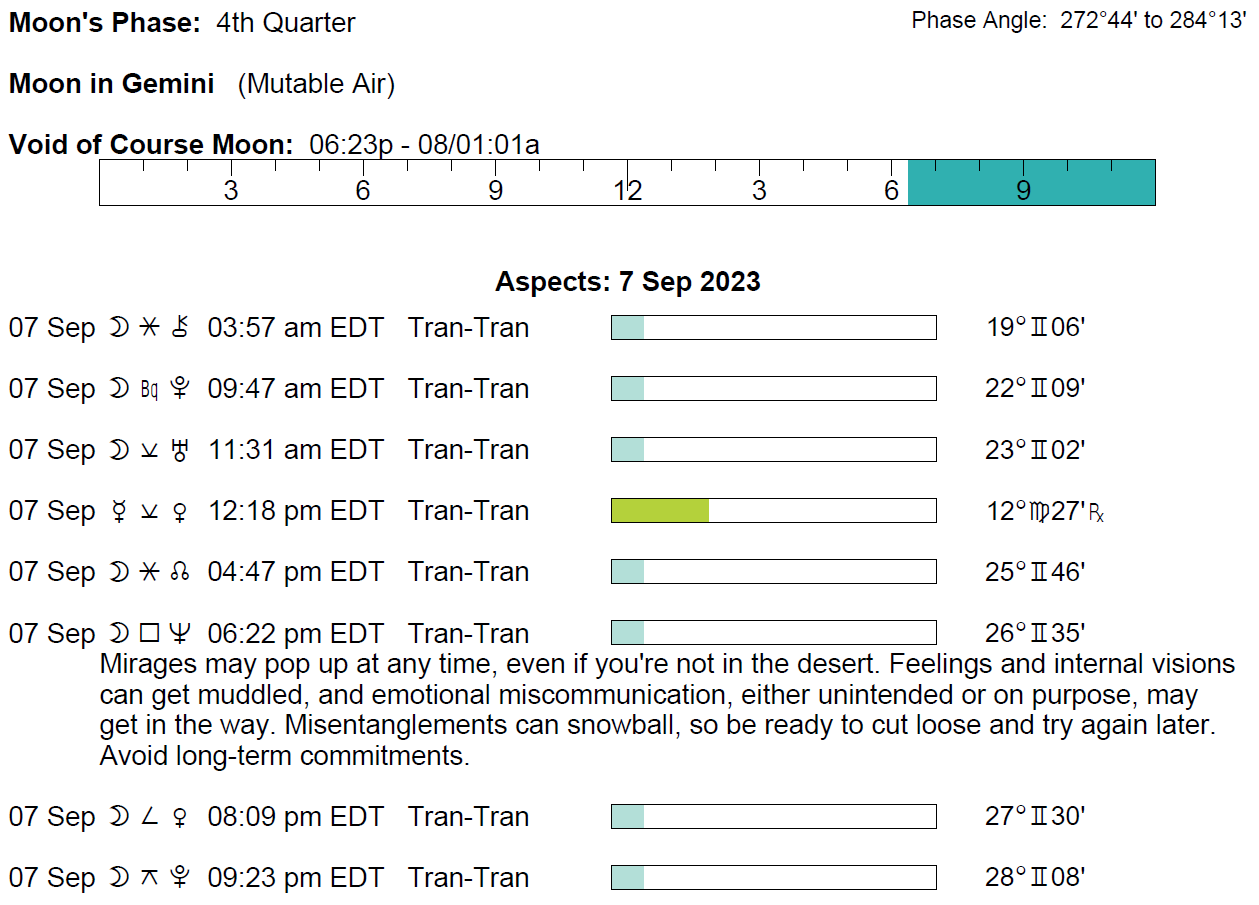 - A void Moon period begins at 6:21 PM today (it will end tomorrow when the Moon enters Cancer at 12:59 AM).