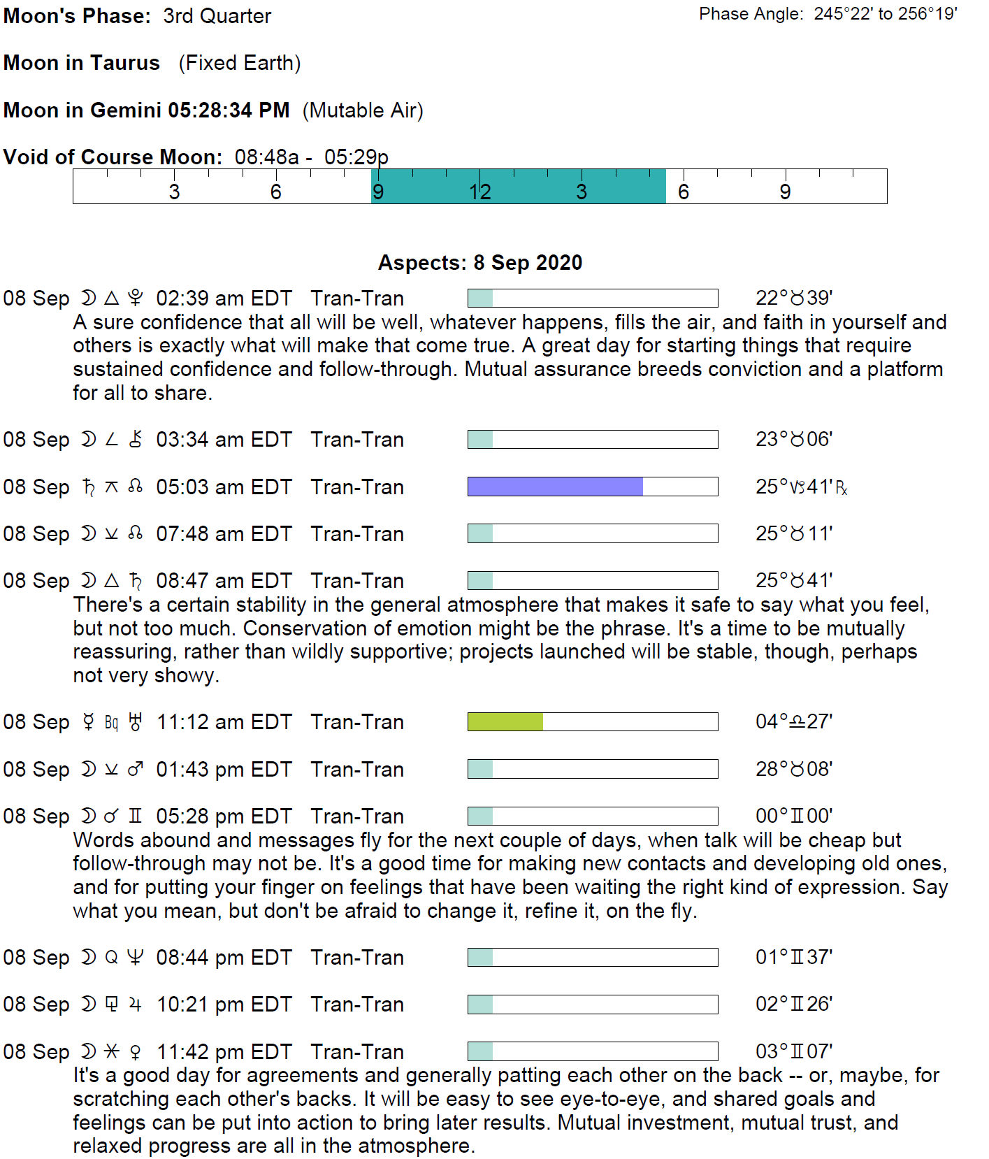 Planet Color Key: The longer the bar, the slower the aspecting planet and the longer the duration of the planet’s transit.