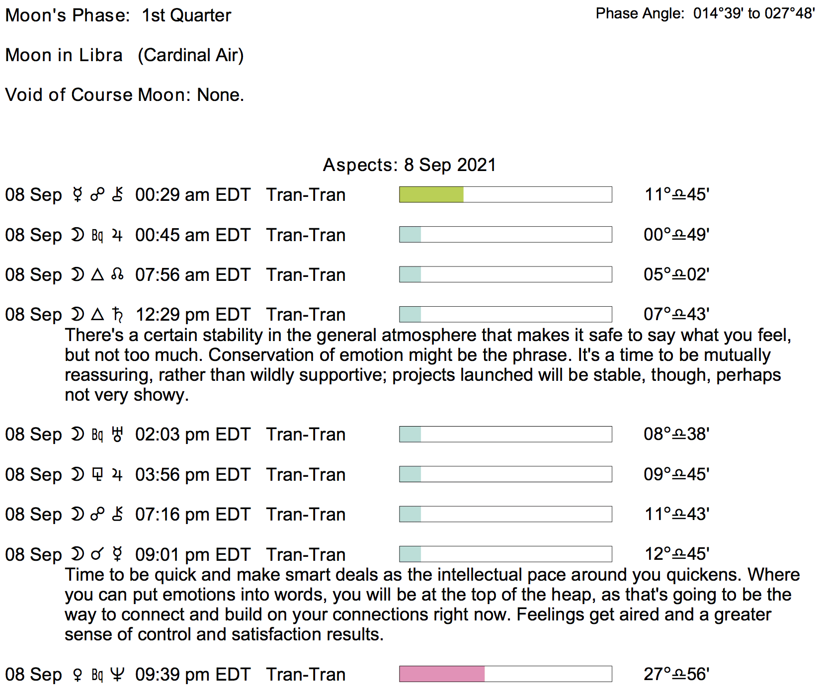 Planet Color Key: The longer the bar, the slower the aspecting planet, and the longer the duration of the planet’s transit.