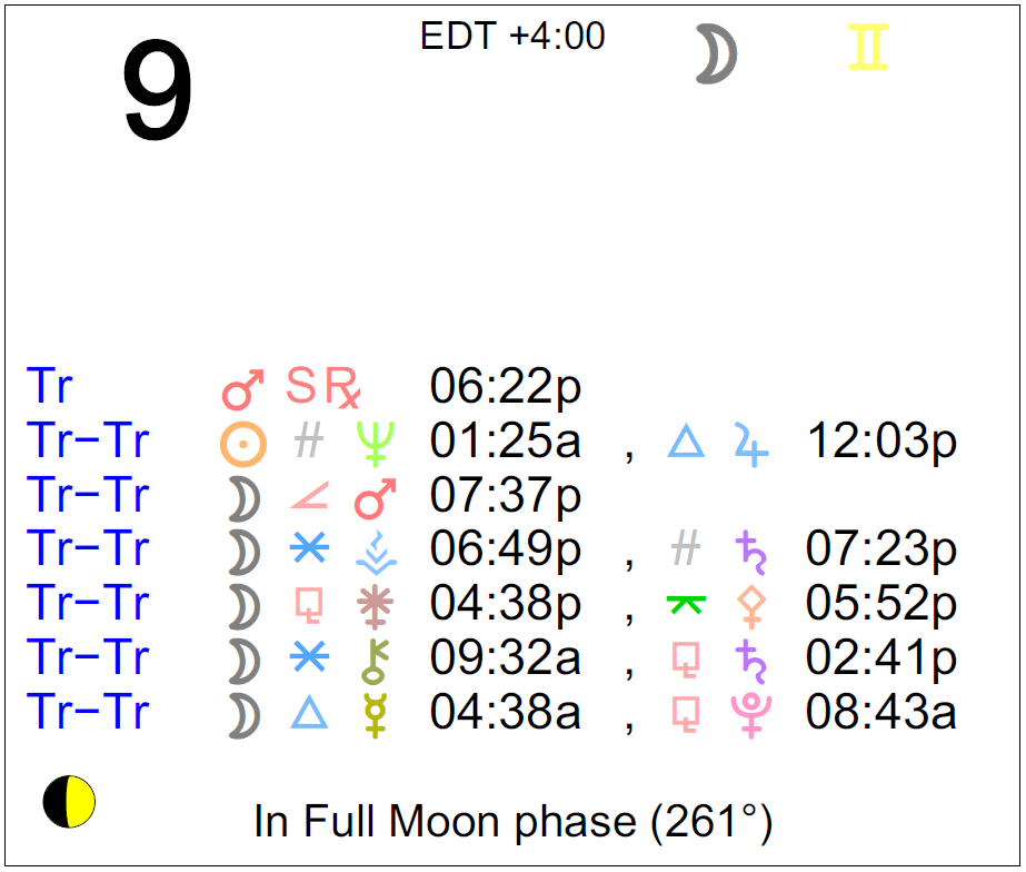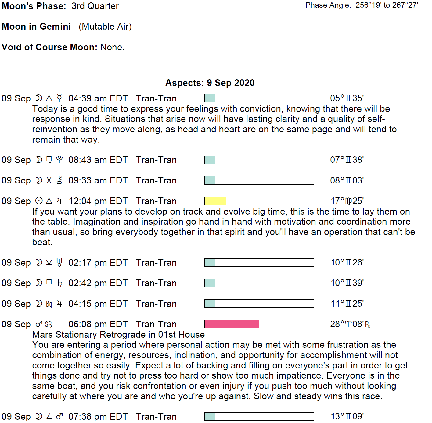 Planet Color Key: The longer the bar, the slower the aspecting planet and the longer the duration of the planet’s transit.