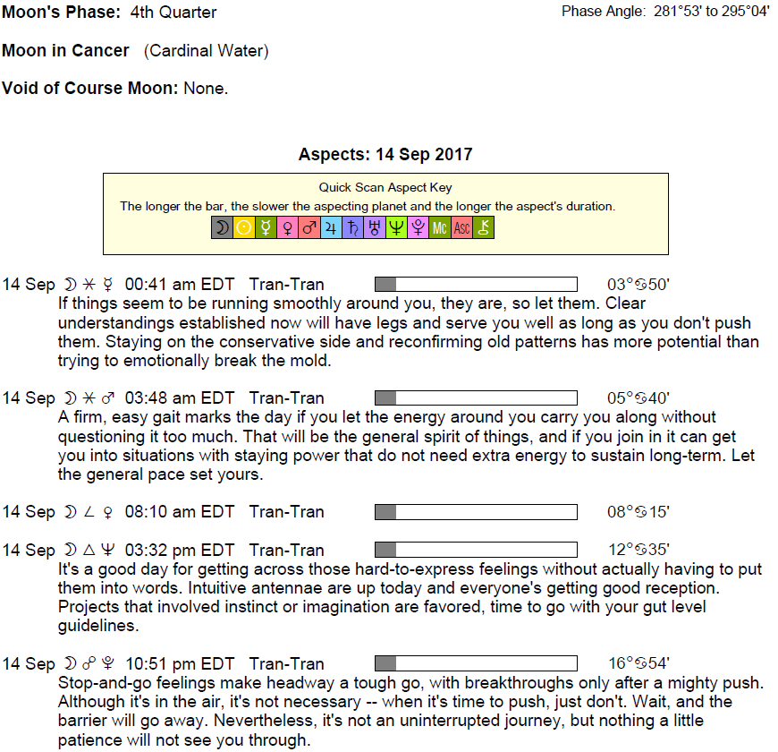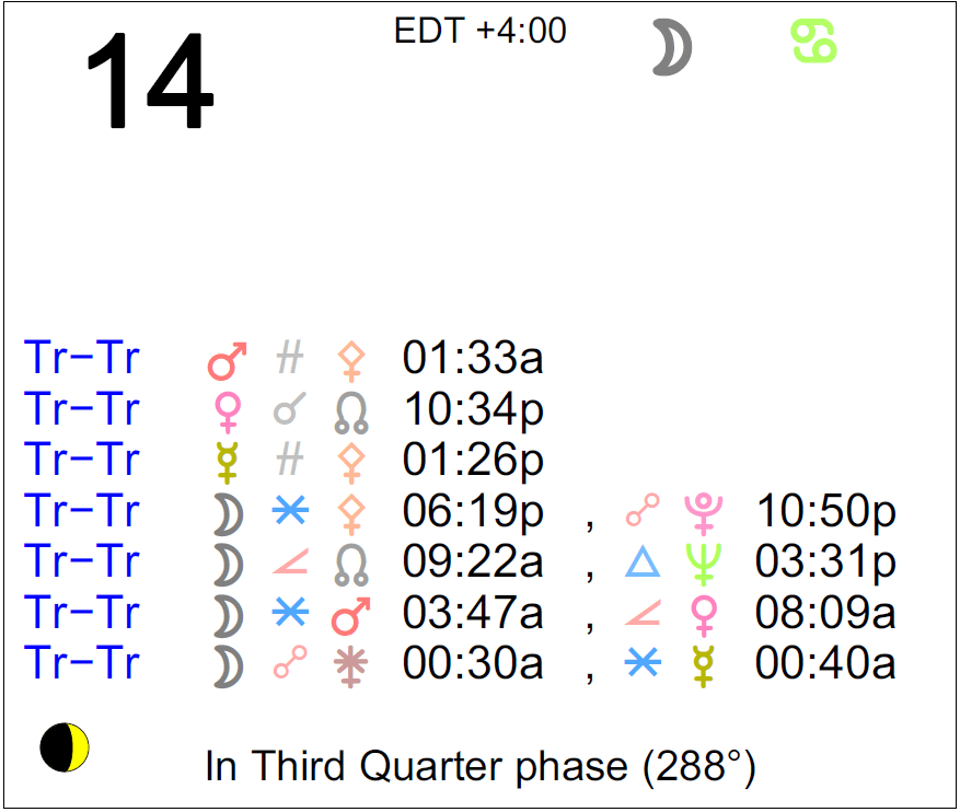The following aspects (major only) and positions are at noon (EDT) on September 14th:
