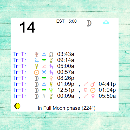 This is a time for seeking out balance, harmony, and peace. It’s also a time to express emotions gracefully, diplomatically, and considerately. There could be a stronger focus on a relationship, partner, or potential partner. The ability to see both sides of a situation or story is a positive, but indecision can be a byproduct. This is a sociable, artistic Moon.