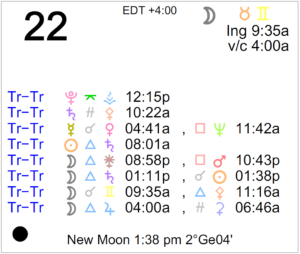 Today's Moon: The Moon is in Gemini until 7:08 PM, after which the Moon transits Cancer. The void Moon period occurs today from 7:09 AM to 7:08 PM. The Moon is waxing and in its New … [Read more...]