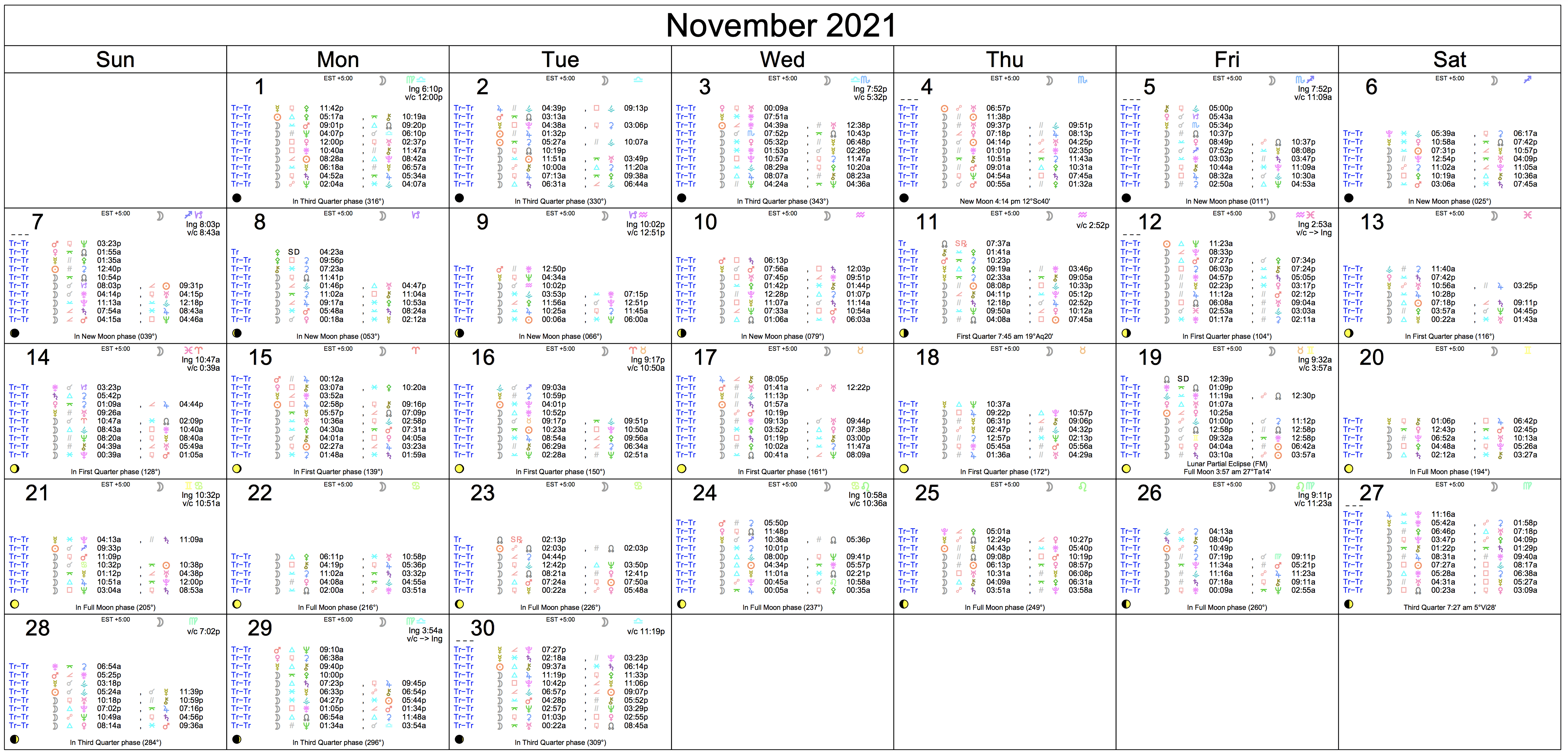 The last week of November can bring themes of money, business, and your intimate life. It’s a fine time for talking about your needs–others are responsive and some of the usual barriers and boundaries dissolve. Family matters tend to run smoothly, and there can be an opportunity to enjoy yourself, an invitation, or simply a delightful, playful mood. Inhibitions tend to drop.