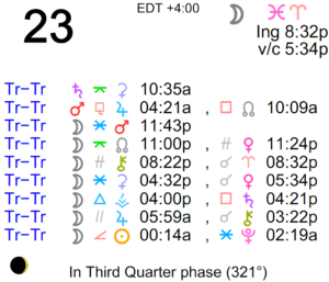 The Moon is in Pisces until 8:32 PM, after which the Moon is in Aries. The Moon is void from 5:34 PM until 8:32 PM. The Moon is waning and in its Last Quarter phase until … [Read more...]