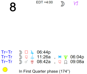 The Moon is in Virgo. The Moon is waxing and in its New phase. The New Moon (Solar Eclipse) occurred yesterday in the sign of Leo, and the First Quarter Moon will occur on … [Read more...]