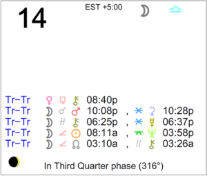 The Moon is in Libra. The Moon is waning and in its Last Quarter phase until 8:11 AM, after which the Moon is in its Waning Crescent phase. The Last Quarter Moon occurred on the 10th … [Read more...]